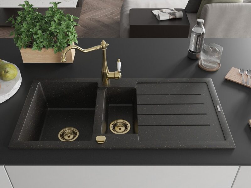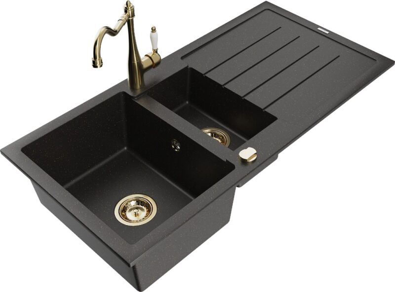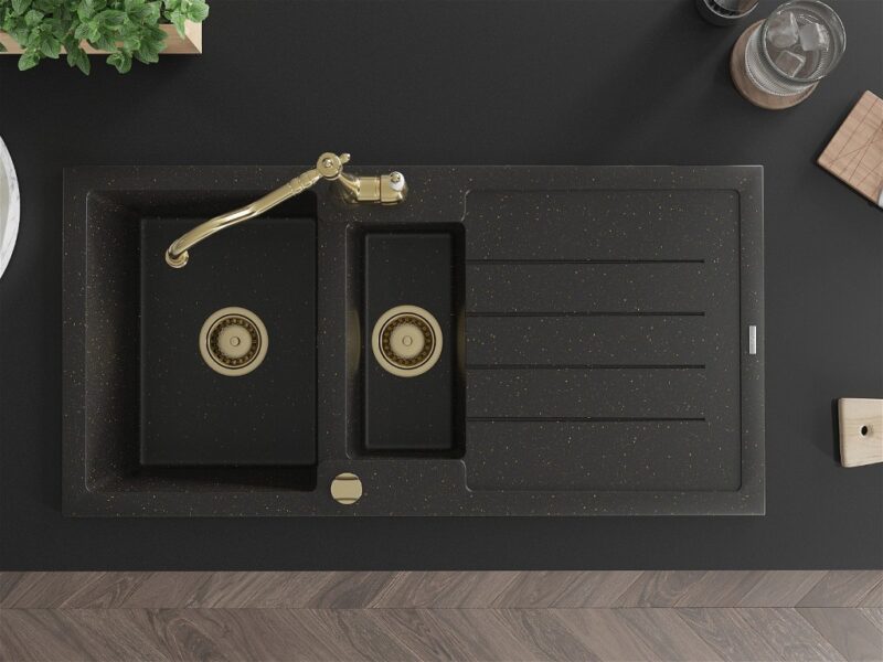 Drez: Rozmer: 1000x500x200 mm Hĺbka komory: 190 mm (väčšia), 115 mm (menšia) Rozmery komory: 430×330 mm (väčšie), 340×170 mm (menšie) Priemer odtoku: ø90 mm Typ: 1,5-miska s odkvapkávačom Typ: Zapustené do pracovnej dosky Farba: čierna / zlatá metalíza Povrchová úprava sifónu: zlatá Materiál: žula (80% žulové kamenivo 20% živice) Prepadový otvor: Áno Otvory: (batérie, automat) 2 Inštalácia: Univerzálna, je možné inštalovať s odkvapkávačom na ľavú alebo pravú stranu Vysoká odolnosť proti poškriabaniu a zmene farby Odolnosť proti tepelným šokom Povrch pre ľahké čistenie Dva dodatočné vyfrézované otvory na samodierovanie ø35 Kuchynská batéria: Materiál: mosadz Farba: Zlatá Hlava: Keramická Perlátor: Áno Typ: Jednopákové Výška batérie: 290 mm Rozsah výtoku: 260 mm(GT) Ean: 5905315041401