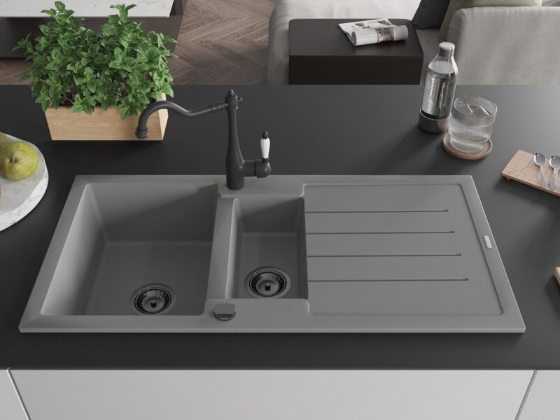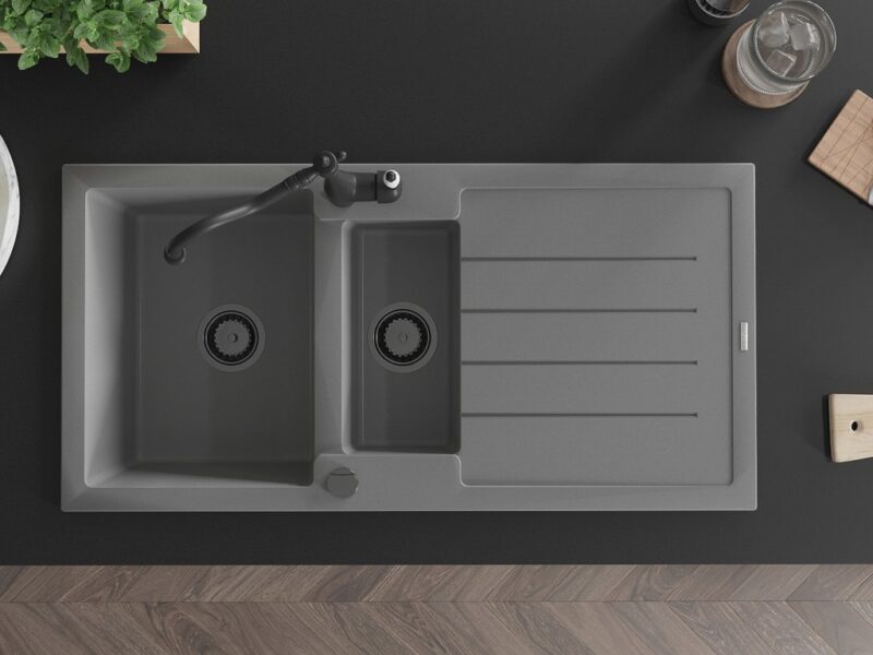 Drez: Rozmer: 1000x500x200 mm Hĺbka komory: 190 mm (väčšia), 115 mm (menšia) Rozmery komory: 430×330 mm (väčšie), 340×170 mm (menšie) Priemer odtoku: ø90 mm Typ: 1,5-miska s odkvapkávačom Typ: Zapustené do pracovnej dosky Šedá farba Povrchová úprava sifónu: čierna Materiál: žula (80% žulové kamenivo 20% živice) Prepadový otvor: Áno Otvory: (batérie, automat) 2 Inštalácia: Univerzálna, je možné inštalovať s odkvapkávačom na ľavú alebo pravú stranu Vysoká odolnosť proti poškriabaniu a zmene farby Odolnosť proti tepelným šokom Povrch pre ľahké čistenie Dva dodatočné vyfrézované otvory na samodierovanie ø35 Kuchynská batéria: Materiál: mosadz Čierna farba Hlava: Keramická Perlátor: Áno Typ: Jednopáková Výška batérie: 290 mm Rozsah výtoku: 260 mm(GT) Ean: 5905315041333