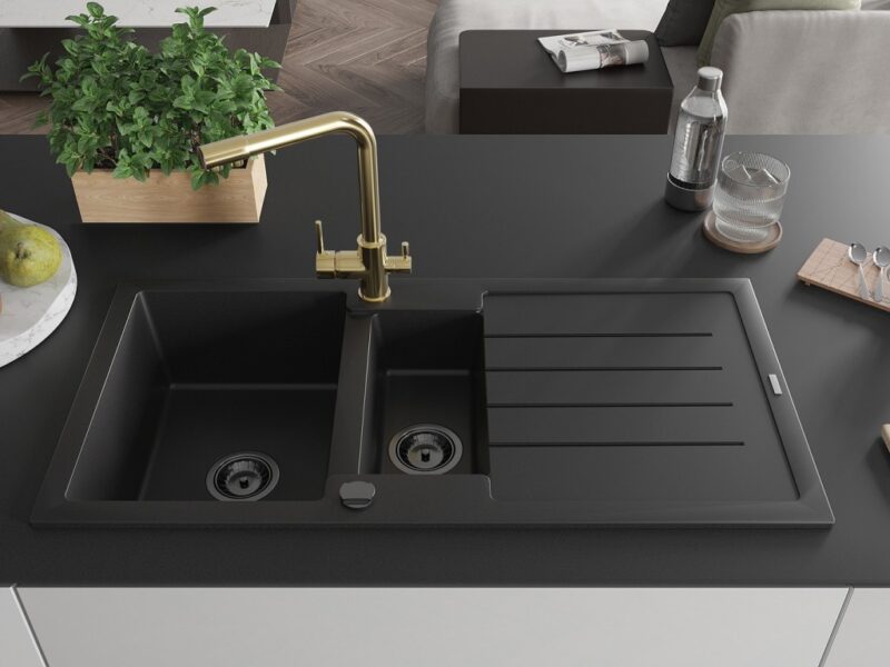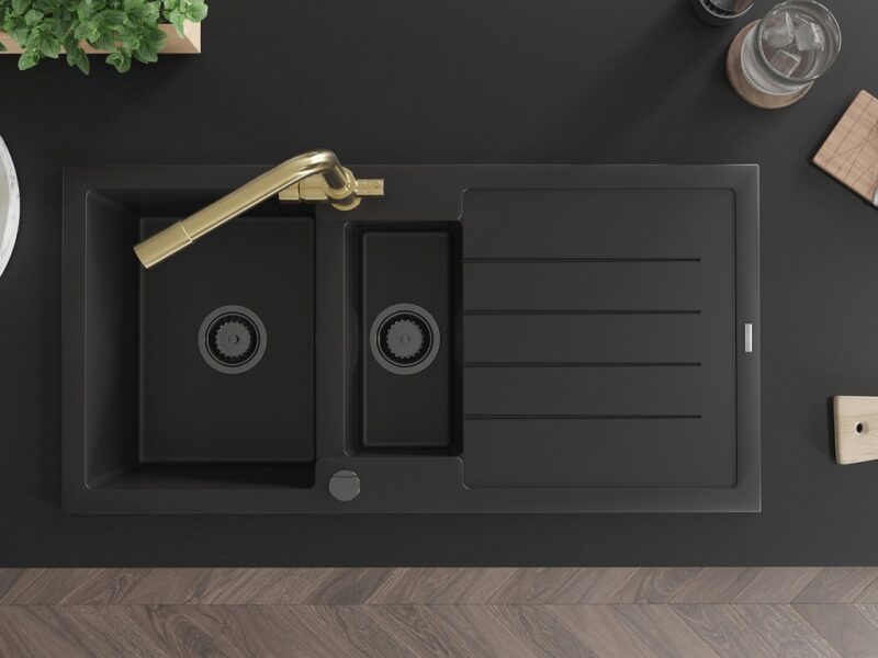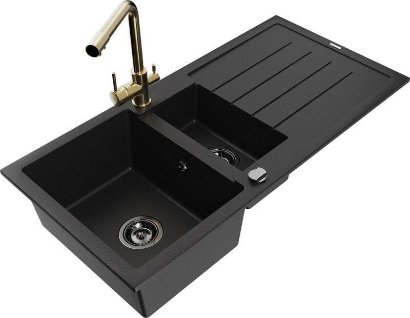 Technické dáta: Drez: Rozmer: 1000x500x200 mm Hĺbka komory: 190 mm (väčšia), 115 mm (menšia) Rozmery komory: 430×330 mm (väčšie), 340×170 mm (menšie) Priemer odtoku: ø90 mm Typ: 1,5-miska s odkvapkávačom Typ: Zapustené do pracovnej dosky Čierna farba Povrchová úprava sifónu: čierna Materiál: žula (80% žulové kamenivo 20% živice) Prepadový otvor: Áno Otvory: (batérie, automat) 2 Inštalácia: Univerzálna, je možné inštalovať s odkvapkávačom na ľavú alebo pravú stranu Vysoká odolnosť proti poškriabaniu a zmene farby Odolnosť proti tepelným šokom Povrch pre ľahké čistenie Dva dodatočné vyfrézované otvory na samodierovanie ø35 Kuchynská batéria: Materiál: mosadz Farba: Zlatá Hlava: Keramická Perlátor: Áno Typ: Dve rukoväte Rozsah výtoku: 235 mm Výška batérie: 315 mm Dvojhlavá batéria s prídavným filtrom na pitnú vodu(GT) Ean: 5905315026149