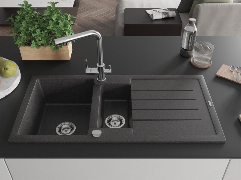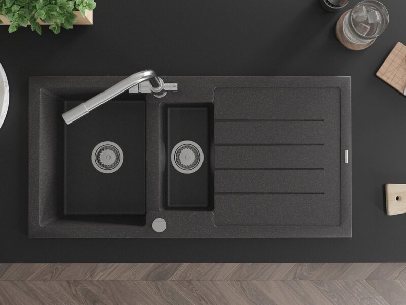 Technické dáta: Drez: Rozmer: 1000x500x200 mm Hĺbka komory: 190 mm (väčšia), 115 mm (menšia) Rozmery komory: 430×330 mm (väčšie), 340×170 mm (menšie) Priemer odtoku: ø90 mm Typ: 1,5-miska s odkvapkávačom Typ: Zapustené do pracovnej dosky Farba: Škvrnitá čierna Povrchová úprava sifónu: Chrome Materiál: žula (80% žulové kamenivo 20% živice) Prepadový otvor: Áno Otvory: (batérie, automat) 2 Inštalácia: Univerzálna, je možné inštalovať s odkvapkávačom na ľavú alebo pravú stranu Vysoká odolnosť proti poškriabaniu a zmene farby Odolnosť proti tepelným šokom Povrch pre ľahké čistenie Dva dodatočné vyfrézované otvory na samodierovanie ø35 Kuchynská batéria: Materiál: mosadz Farba: Chrome Hlava: Keramická Perlátor: Áno Typ: Dve rukoväte Rozsah výtoku: 235 mm Výška batérie: 315 mm Dvojhlavá batéria s prídavným filtrom na pitnú vodu(GT) Ean: 5905315026071