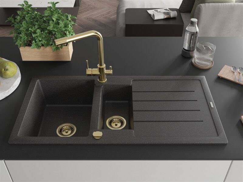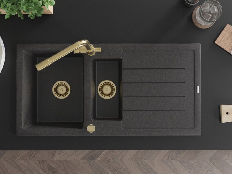 Technické dáta: Drez: Rozmer: 1000x500x200 mm Hĺbka komory: 190 mm (väčšia), 115 mm (menšia) Rozmery komory: 430×330 mm (väčšie), 340×170 mm (menšie) Priemer odtoku: ø90 mm Typ: 1,5-miska s odkvapkávačom Typ: Zapustené do pracovnej dosky Farba: Škvrnitá čierna Povrchová úprava sifónu: zlatá Materiál: žula (80% žulové kamenivo 20% živice) Prepadový otvor: Áno Otvory: (batérie, automat) 2 Inštalácia: Univerzálna, je možné inštalovať s odkvapkávačom na ľavú alebo pravú stranu Vysoká odolnosť proti poškriabaniu a zmene farby Odolnosť proti tepelným šokom Povrch pre ľahké čistenie Dva dodatočné vyfrézované otvory na samodierovanie ø35 Kuchynská batéria: Materiál: mosadz Farba: Zlatá Hlava: Keramická Perlátor: Áno Typ: Dve rukoväte Rozsah výtoku: 235 mm Výška batérie: 315 mm Dvojhlavá batéria s prídavným filtrom na pitnú vodu(GT) Ean: 5905315026088