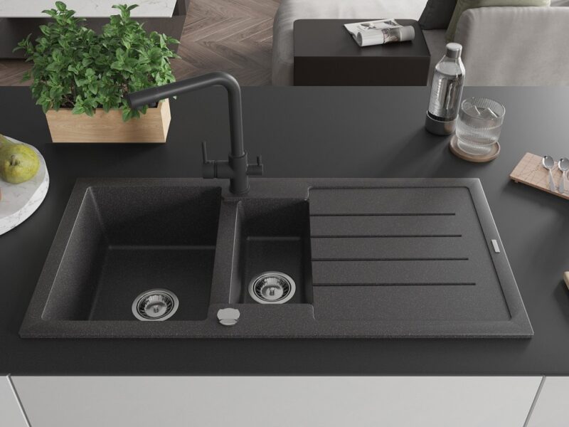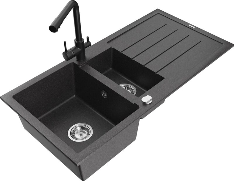 Technické dáta: Drez: Rozmer: 1000x500x200 mm Hĺbka komory: 190 mm (väčšia), 115 mm (menšia) Rozmery komory: 430×330 mm (väčšie), 340×170 mm (menšie) Priemer odtoku: ø90 mm Typ: 1,5-miska s odkvapkávačom Typ: Zapustené do pracovnej dosky Farba: Škvrnitá čierna Povrchová úprava sifónu: Chrome Materiál: žula (80% žulové kamenivo 20% živice) Prepadový otvor: Áno Otvory: (batérie, automat) 2 Inštalácia: Univerzálna, je možné inštalovať s odkvapkávačom na ľavú alebo pravú stranu Vysoká odolnosť proti poškriabaniu a zmene farby Odolnosť proti tepelným šokom Povrch pre ľahké čistenie Dva dodatočné vyfrézované otvory na samodierovanie ø35 Kuchynská batéria: Materiál: mosadz Čierna farba Hlava: Keramická Perlátor: Áno Typ: Dve rukoväte Rozsah výtoku: 235 mm Výška batérie: 315 mm Dvojhlavá batéria s prídavným filtrom na pitnú vodu(GT) Ean: 5905315026095