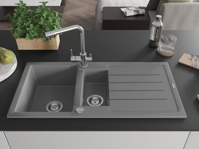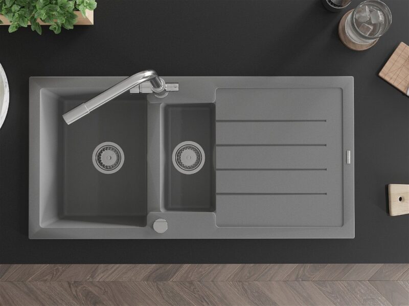 Technické dáta: Drez: Rozmer: 1000x500x200 mm Hĺbka komory: 190 mm (väčšia), 115 mm (menšia) Rozmery komory: 430×330 mm (väčšie), 340×170 mm (menšie) Priemer odtoku: ø90 mm Typ: 1,5-miska s odkvapkávačom Typ: Zapustené do pracovnej dosky Šedá farba Povrchová úprava sifónu: Chrome Materiál: žula (80% žulové kamenivo 20% živice) Prepadový otvor: Áno Otvory: (batérie, automat) 2 Inštalácia: Univerzálna, je možné inštalovať s odkvapkávačom na ľavú alebo pravú stranu Vysoká odolnosť proti poškriabaniu a zmene farby Odolnosť proti tepelným šokom Povrch pre ľahké čistenie Dva dodatočné vyfrézované otvory na samodierovanie ø35 Kuchynská batéria: Materiál: mosadz Farba: Chrome Hlava: Keramická Perlátor: Áno Typ: Dve rukoväte Rozsah výtoku: 235 mm Výška batérie: 315 mm Dvojhlavá batéria s prídavným filtrom na pitnú vodu(GT) Ean: 5905315025937