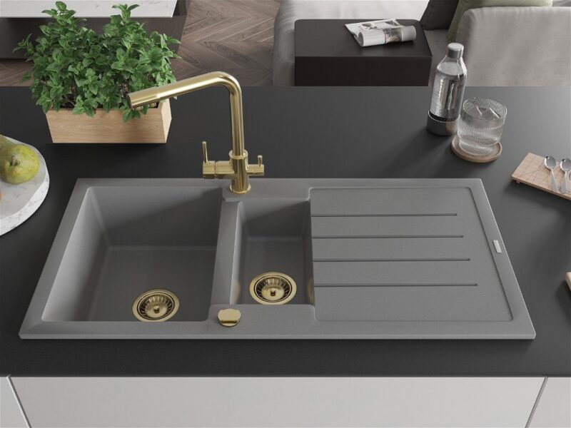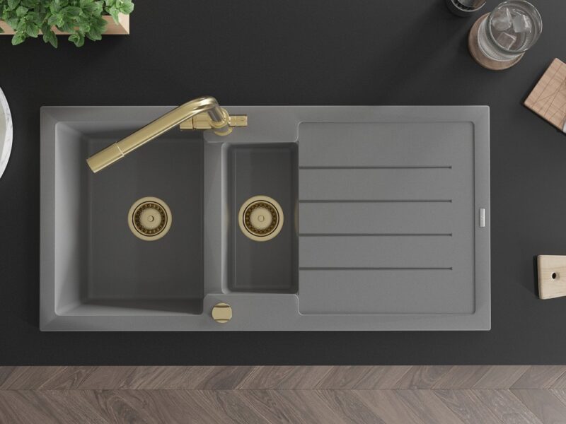 Technické dáta: Drez: Rozmer: 1000x500x200 mm Hĺbka komory: 190 mm (väčšia), 115 mm (menšia) Rozmery komory: 430×330 mm (väčšie), 340×170 mm (menšie) Priemer odtoku: ø90 mm Typ: 1,5-miska s odkvapkávačom Typ: Zapustené do pracovnej dosky Šedá farba Povrchová úprava sifónu: zlatá Materiál: žula (80% žulové kamenivo 20% živice) Prepadový otvor: Áno Otvory: (batérie, automat) 2 Inštalácia: Univerzálna, je možné inštalovať s odkvapkávačom na ľavú alebo pravú stranu Vysoká odolnosť proti poškriabaniu a zmene farby Odolnosť proti tepelným šokom Povrch pre ľahké čistenie Dva dodatočné vyfrézované otvory na samodierovanie ø35 Kuchynská batéria: Materiál: mosadz Farba: Zlatá Hlava: Keramická Perlátor: Áno Typ: Dve rukoväte Rozsah výtoku: 235 mm Výška batérie: 315 mm Dvojhlavá batéria s prídavným filtrom na pitnú vodu(GT) Ean: 5905315025944