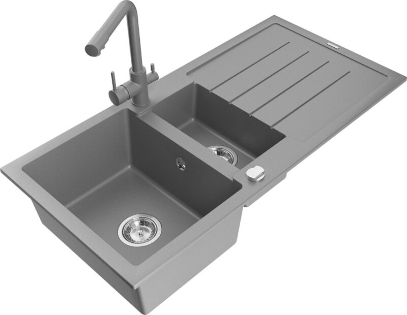 Technické dáta: Drez: Rozmer: 1000x500x200 mm Hĺbka komory: 190 mm (väčšia), 115 mm (menšia) Rozmery komory: 430×330 mm (väčšie), 340×170 mm (menšie) Priemer odtoku: ø90 mm Typ: 1,5-miska s odkvapkávačom Typ: Zapustené do pracovnej dosky Šedá farba Povrchová úprava sifónu: Chrome Materiál: žula (80% žulové kamenivo 20% živice) Prepadový otvor: Áno Otvory: (batérie, automat) 2 Inštalácia: Univerzálna, je možné inštalovať s odkvapkávačom na ľavú alebo pravú stranu Vysoká odolnosť proti poškriabaniu a zmene farby Odolnosť proti tepelným šokom Povrch pre ľahké čistenie Dva dodatočné vyfrézované otvory na samodierovanie ø35 Kuchynská batéria: Materiál: mosadz Šedá farba Hlava: Keramická Perlátor: Áno Typ: Dve rukoväte Rozsah výtoku: 235 mm Výška batérie: 315 mm Dvojhlavá batéria s prídavným filtrom na pitnú vodu(GT) Ean: 5905315025975