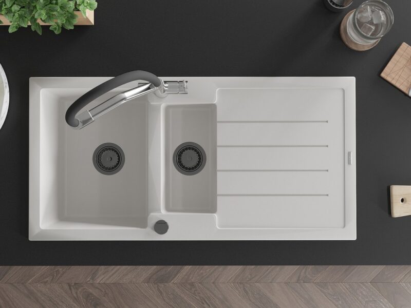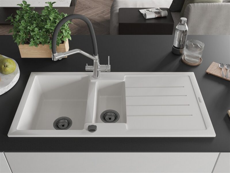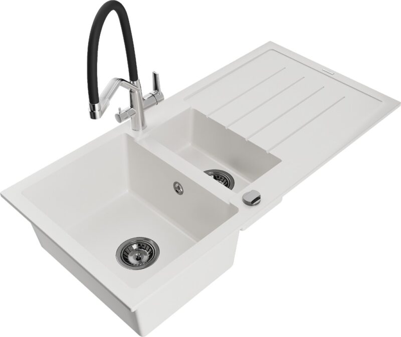 Technické údaje: Kuchynský drez: Rozmer: 1000x500x200 mm Hĺbka komory: 190 mm (väčšia), 115 mm (menšia) Rozmery komory: 430×330 mm (väčšie), 340×170 mm (menšie) Priemer odtoku: ø90 mm Typ: 1,5-miska s odkvapkávačom Typ: Zapustené do pracovnej dosky Farba: Biela Povrchová úprava sifónu: čierna Materiál: žula (80% žulové kamenivo 20% živice) Prepadový otvor: Áno Otvory: (batérie, automat) 2 Inštalácia: Univerzálna, je možné inštalovať s odkvapkávačom na ľavú alebo pravú stranu Vysoká odolnosť proti poškriabaniu a zmene farby Odolnosť proti tepelným šokom Povrch pre ľahké čistenie Dva dodatočné vyfrézované otvory na samodierovanie ø35 Kuchynská batéria: Materiál: mosadz Farba: chróm/čierna Hlavy: Keramické Perlátor: Áno Typ výtoku: Flexibilný s mosadzným držiakom Rozsah výtoku: 260 mm Výška: 405 mm Typ: Dve rukoväte Dvojhlavá batéria s prídavným filtrom na pitnú vodu(GT) Ean: 5905315102621