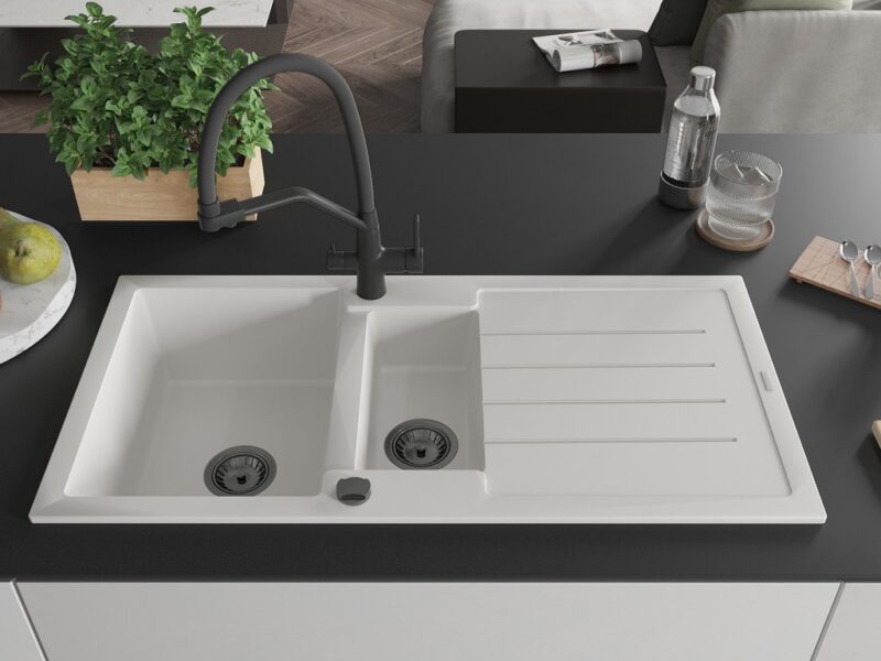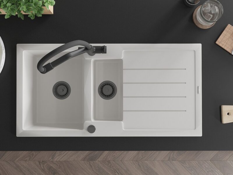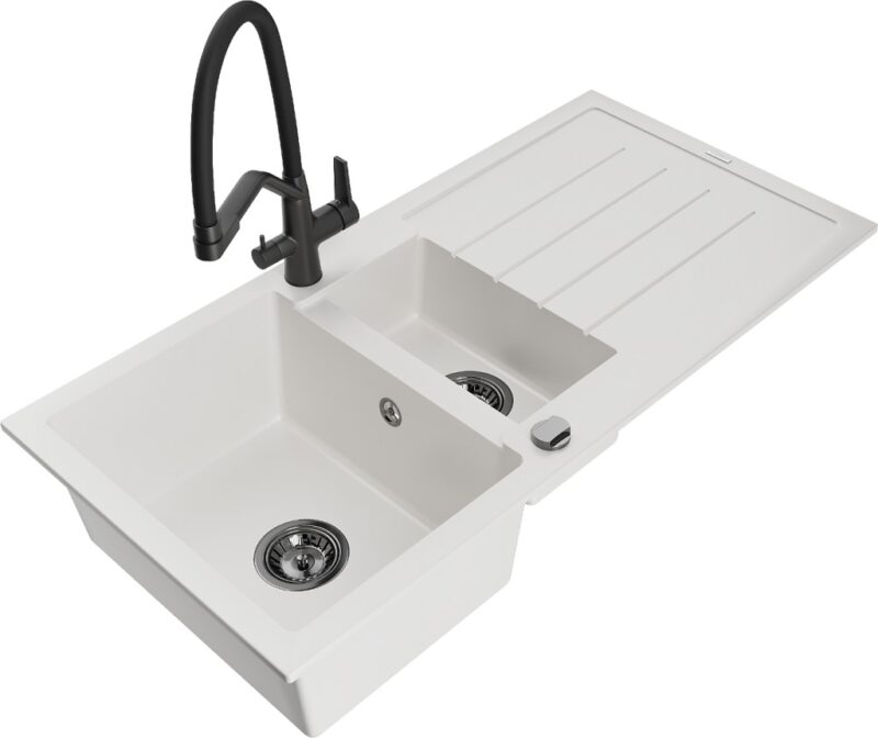 Technické údaje: Kuchynský drez: Rozmer: 1000x500x200 mm Hĺbka komory: 190 mm (väčšia), 115 mm (menšia) Rozmery komory: 430×330 mm (väčšie), 340×170 mm (menšie) Priemer odtoku: ø90 mm Typ: 1,5-miska s odkvapkávačom Typ: Zapustené do pracovnej dosky Farba: Biela Povrchová úprava sifónu: čierna Materiál: žula (80% žulové kamenivo 20% živice) Prepadový otvor: Áno Otvory: (batérie, automat) 2 Inštalácia: Univerzálna, je možné inštalovať s odkvapkávačom na ľavú alebo pravú stranu Vysoká odolnosť proti poškriabaniu a zmene farby Odolnosť proti tepelným šokom Povrch pre ľahké čistenie Dva dodatočné vyfrézované otvory na samodierovanie ø35 Kuchynská batéria: Materiál: mosadz Farba: Čierna Hlavy: Keramické Perlátor: Áno Typ výtoku: Flexibilný s mosadzným držiakom Rozsah výtoku: 260 mm Výška: 405 mm Typ: Dve rukoväte Dvojhlavá batéria s prídavným filtrom na pitnú vodu(GT) Ean: 5905315102652