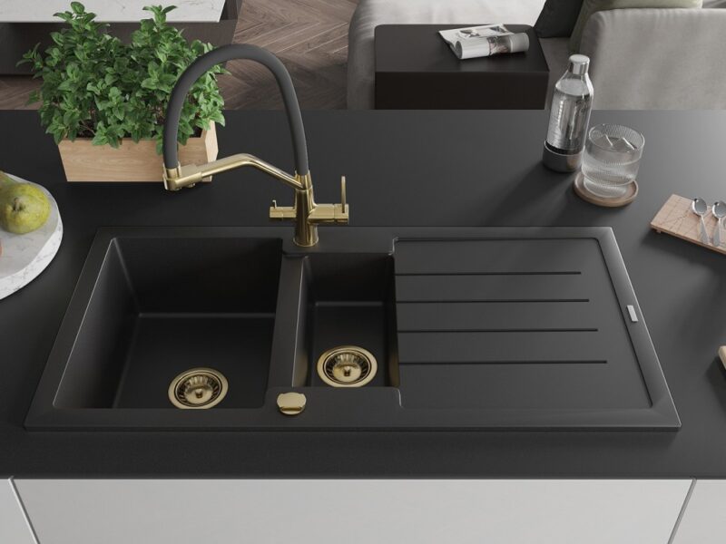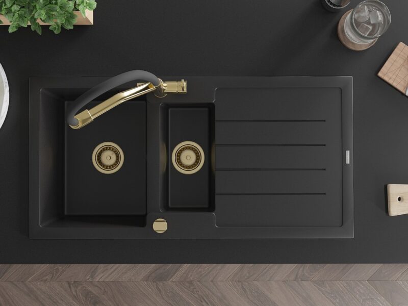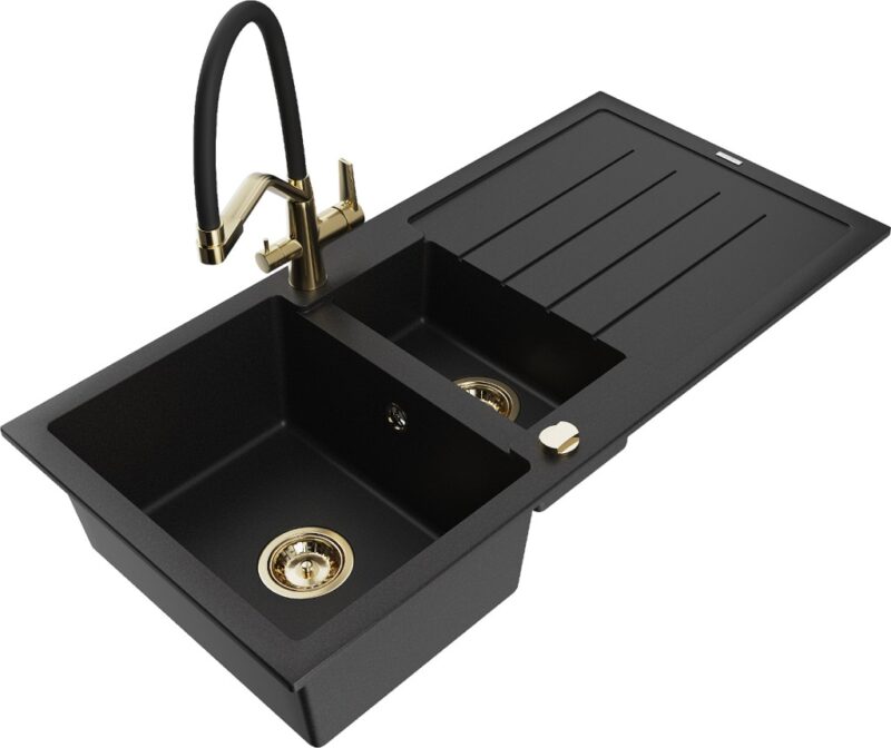 Technické dáta: Drez: Rozmer: 1000x500x200 mm Hĺbka komory: 190 mm (väčšia), 115 mm (menšia) Rozmery komory: 430×330 mm (väčšie), 340×170 mm (menšie) Priemer odtoku: ø90 mm Typ: 1,5-miska s odkvapkávačom Typ: Zapustené do pracovnej dosky Čierna farba Povrchová úprava sifónu: zlatá Materiál: žula (80% žulové kamenivo 20% živice) Prepadový otvor: Áno Otvory: (batérie, automat) 2 Inštalácia: Univerzálna, je možné inštalovať s odkvapkávačom na ľavú alebo pravú stranu Vysoká odolnosť proti poškriabaniu a zmene farby Odolnosť proti tepelným šokom Povrch pre ľahké čistenie Dva dodatočné vyfrézované otvory na samodierovanie ø35 Kuchynská batéria: Materiál: mosadz Farba: Zlatá/Čierna Hlavy: Keramické Perlátor: Áno Typ výtoku: Flexibilný s mosadzným držiakom Rozsah výtoku: 260 mm Výška: 405 mm Typ: Dve rukoväte Dvojhlavá batéria s prídavným filtrom na pitnú vodu(GT) Ean: 5905315054661