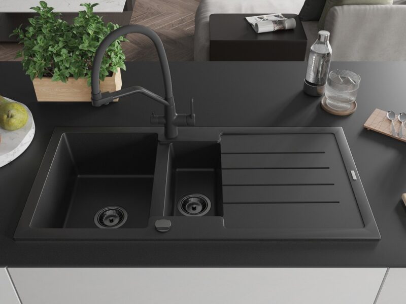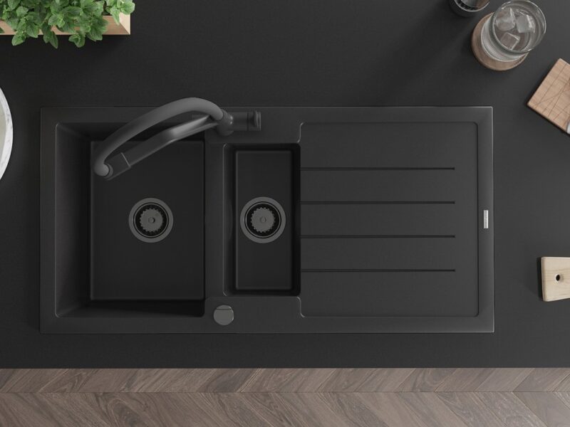 Technické dáta: Drez: Rozmer: 1000x500x200 mm Hĺbka komory: 190 mm (väčšia), 115 mm (menšia) Rozmery komory: 430×330 mm (väčšie), 340×170 mm (menšie) Priemer odtoku: ø90 mm Typ: 1,5-miska s odkvapkávačom Typ: Zapustené do pracovnej dosky Čierna farba Povrchová úprava sifónu: čierna Materiál: žula (80% žulové kamenivo 20% živice) Prepadový otvor: Áno Otvory: (batérie, automat) 2 Inštalácia: Univerzálna, je možné inštalovať s odkvapkávačom na ľavú alebo pravú stranu Vysoká odolnosť proti poškriabaniu a zmene farby Odolnosť proti tepelným šokom Povrch pre ľahké čistenie Dva dodatočné vyfrézované otvory na samodierovanie ø35 Kuchynská batéria: Materiál: mosadz Čierna farba Hlavy: Keramické Perlátor: Áno Typ výtoku: Flexibilný s mosadznou podperou Rozsah výtoku: 260 mm Výška: 405 mm Typ: Dve rukoväte Dvojhlavá batéria s prídavným filtrom na pitnú vodu(GT) Ean: 5905315054685
