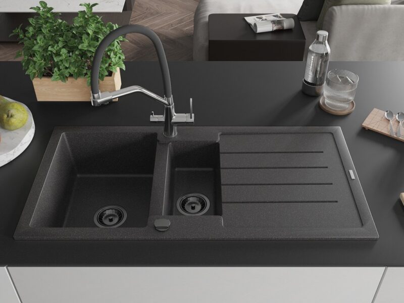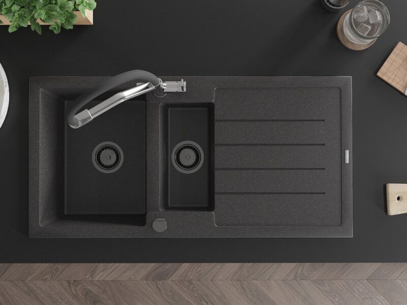 Technické dáta: Drez: Rozmer: 1000x500x200 mm Hĺbka komory: 190 mm (väčšia), 115 mm (menšia) Rozmery komory: 430×330 mm (väčšie), 340×170 mm (menšie) Priemer odtoku: ø90 mm Typ: 1,5-miska s odkvapkávačom Typ: Zapustené do pracovnej dosky Farba: Škvrnitá čierna Povrchová úprava sifónu: čierna Materiál: žula (80% žulové kamenivo 20% živice) Prepadový otvor: Áno Otvory: (batérie, automat) 2 Inštalácia: Univerzálna, je možné inštalovať s odkvapkávačom na ľavú alebo pravú stranu Vysoká odolnosť proti poškriabaniu a zmene farby Odolnosť proti tepelným šokom Povrch pre ľahké čistenie Dva dodatočné vyfrézované otvory na samodierovanie ø35 Kuchynská batéria: Materiál: mosadz Farba: chróm/čierna Hlavy: Keramické Perlátor: Áno Typ výtoku: Flexibilný s mosadzným držiakom Rozsah výtoku: 260 mm Výška: 405 mm Typ: Dve rukoväte Dvojhlavá batéria s prídavným filtrom na pitnú vodu(GT) Ean: 5905315102874