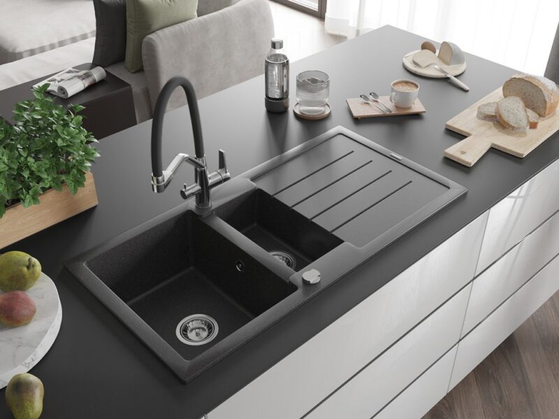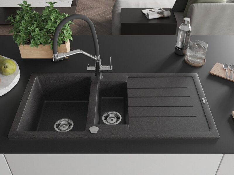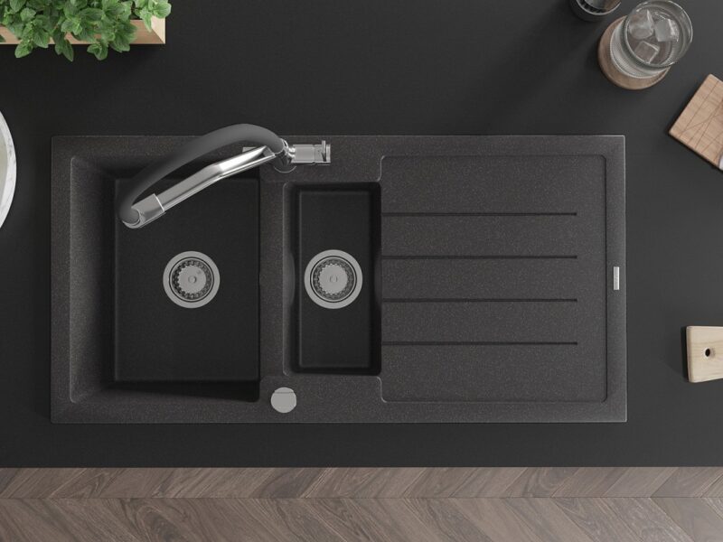Technické dáta: Drez: Rozmer: 1000x500x200 mm Hĺbka komory: 190 mm (väčšia), 115 mm (menšia) Rozmery komory: 430×330 mm (väčšie), 340×170 mm (menšie) Priemer odtoku: ø90 mm Typ: 1,5-miska s odkvapkávačom Typ: Zapustené do pracovnej dosky Farba: Škvrnitá čierna Povrchová úprava sifónu: Chrome Materiál: žula (80% žulové kamenivo 20% živice) Prepadový otvor: Áno Otvory: (batérie, automat) 2 Inštalácia: Univerzálna, je možné inštalovať s odkvapkávačom na ľavú alebo pravú stranu Vysoká odolnosť proti poškriabaniu a zmene farby Odolnosť proti tepelným šokom Povrch pre ľahké čistenie Dva dodatočné vyfrézované otvory na samodierovanie ø35 Kuchynská batéria: Materiál: mosadz Farba: chróm/čierna Hlavy: Keramické Perlátor: Áno Typ výtoku: Flexibilný s mosadznou podperou Rozsah výtoku: 260 mm Výška: 405 mm Typ: Dve rukoväte Dvojhlavá batéria s prídavným filtrom na pitnú vodu(GT) Ean: 5905315102867
