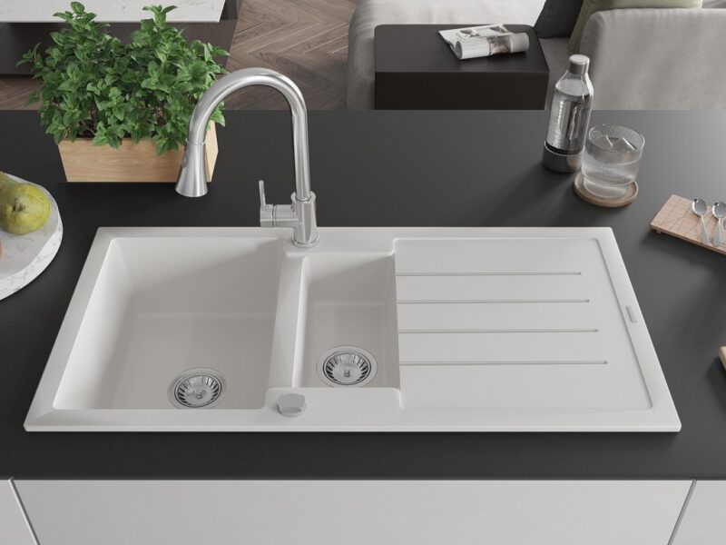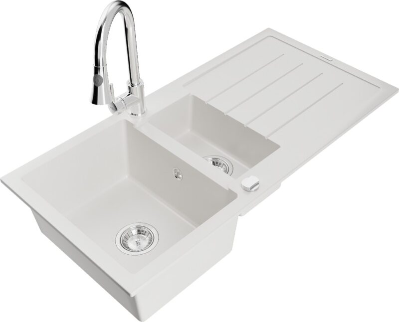 Technické údaje: Kuchynský drez: Rozmer: 1000x500x200 mm Hĺbka komory: 190 mm (väčšia), 115 mm (menšia) Rozmery komory: 430×330 mm (väčšie), 340×170 mm (menšie) Priemer odtoku: ø90 mm Typ: 1,5-miska s odkvapkávačom Typ: Zapustené do pracovnej dosky Farba: Biela Povrchová úprava sifónu: Chrome Materiál: žula (80% žulové kamenivo 20% živice) Prepadový otvor: Áno Otvory: (batérie, automat) 2 Inštalácia: Univerzálna, je možné inštalovať s odkvapkávačom na ľavú alebo pravú stranu Vysoká odolnosť proti poškriabaniu a zmene farby Odolnosť proti tepelným šokom Povrch pre ľahké čistenie Dva dodatočné vyfrézované otvory na samodierovanie ø35 Kuchynská batéria: Materiál: mosadz Farba: Chrome Hlava: Keramická Perlátor: Áno Typ: Jednopákové Výška batérie: 380 mm Rozsah výtoku: 252 mm Typ výtoku: Výsuvný(GT) Ean: 5905315030979