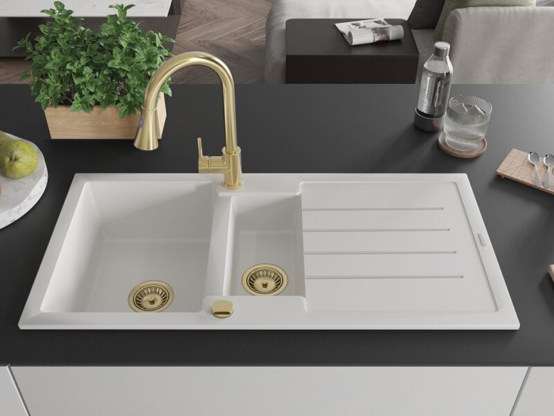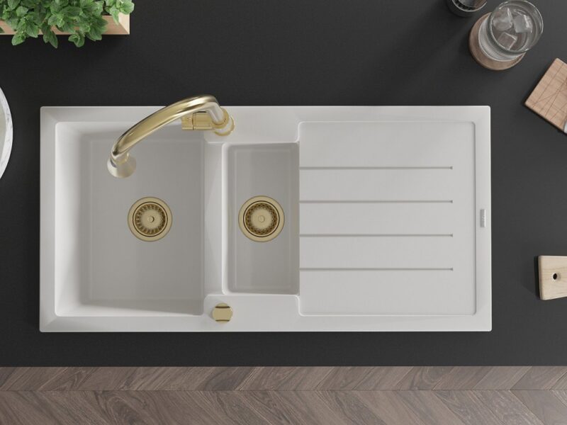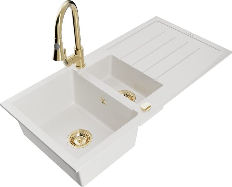 Technické údaje: Kuchynský drez: Rozmer: 1000x500x200 mm Hĺbka komory: 190 mm (väčšia), 115 mm (menšia) Rozmery komory: 430×330 mm (väčšie), 340×170 mm (menšie) Priemer odtoku: ø90 mm Typ: 1,5-miska s odkvapkávačom Typ: Zapustené do pracovnej dosky Farba: Biela Povrchová úprava sifónu: zlatá Materiál: žula (80% žulové kamenivo 20% živice) Prepadový otvor: Áno Otvory: (batérie, automat) 2 Inštalácia: Univerzálna, je možné inštalovať s odkvapkávačom na ľavú alebo pravú stranu Vysoká odolnosť proti poškriabaniu a zmene farby Odolnosť proti tepelným šokom Povrch pre ľahké čistenie Dva dodatočné vyfrézované otvory na samodierovanie ø35 Kuchynská batéria: Materiál: mosadz Farba: Zlatá Hlava: Keramická Perlátor: Áno Typ: Jednopáková Výška batérie: 380 mm Rozsah výtoku: 252 mm Typ výtoku: Výsuvný(GT) Ean: 5905315030993
