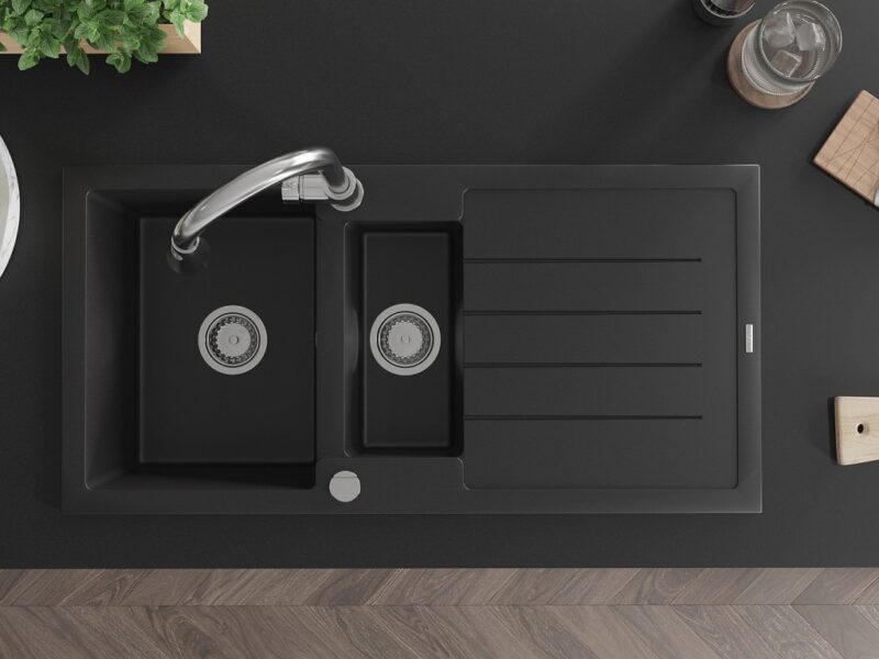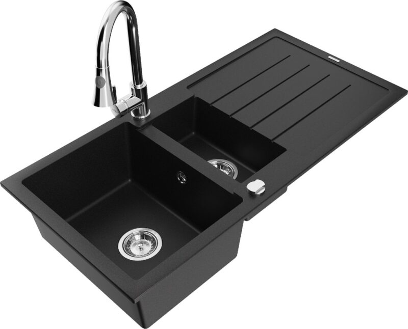 Technické dáta: Drez: Rozmer: 1000x500x200 mm Hĺbka komory: 190 mm (väčšia), 115 mm (menšia) Rozmery komory: 430×330 mm (väčšie), 340×170 mm (menšie) Priemer odtoku: ø90 mm Typ: 1,5-miska s odkvapkávačom Typ: Zapustené do pracovnej dosky Čierna farba Povrchová úprava sifónu: Chrome Materiál: žula (80% žulové kamenivo 20% živice) Prepadový otvor: Áno Otvory: (batérie, automat) 2 Inštalácia: Univerzálna, je možné inštalovať s odkvapkávačom na ľavú alebo pravú stranu Vysoká odolnosť proti poškriabaniu a zmene farby Odolnosť proti tepelným šokom Povrch pre ľahké čistenie Dva dodatočné vyfrézované otvory na samodierovanie ø35 Kuchynská batéria: Materiál: mosadz Farba: Chrome Hlava: Keramická Perlátor: Áno Typ: Jednopáková Výška batérie: 380 mm Rozsah výtoku: 252 mm Typ výtoku: Výsuvný(GT) Ean: 5905315031242