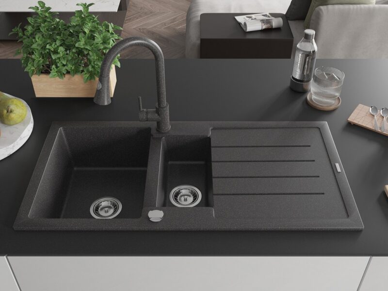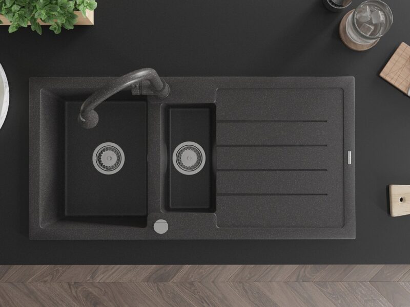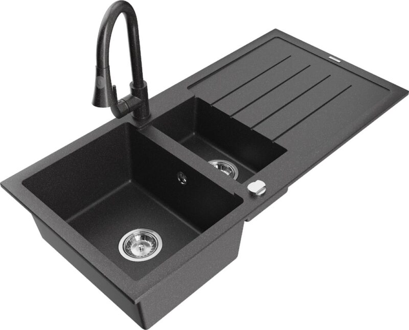 Technické dáta: Drez: Rozmer: 1000x500x200 mm Hĺbka komory: 190 mm (väčšia), 115 mm (menšia) Rozmery komory: 430×330 mm (väčšie), 340×170 mm (menšie) Priemer odtoku: ø90 mm Typ: 1,5-miska s odkvapkávačom Typ: Zapustené do pracovnej dosky Farba: Škvrnitá čierna Povrchová úprava sifónu: Chrome Materiál: žula (80% žulové kamenivo 20% živice) Prepadový otvor: Áno Otvory: (batérie, automat) 2 Inštalácia: Univerzálna, je možné inštalovať s odkvapkávačom na ľavú alebo pravú stranu Vysoká odolnosť proti poškriabaniu a zmene farby Odolnosť proti tepelným šokom Povrch pre ľahké čistenie Dva dodatočné vyfrézované otvory na samodierovanie ø35 Kuchynská batéria: Materiál: mosadz Farba: Škvrnitá čierna Hlava: Keramická Perlátor: Áno Typ: Jednopáková Výška batérie: 380 mm Rozsah výtoku: 252 mm Typ výtoku: Výsuvný(GT) Ean: 5905315031235