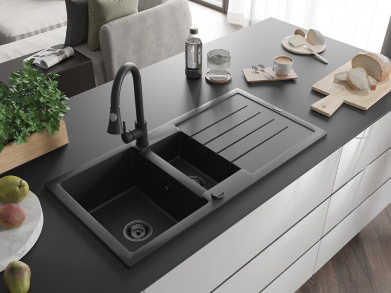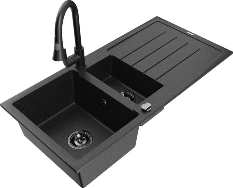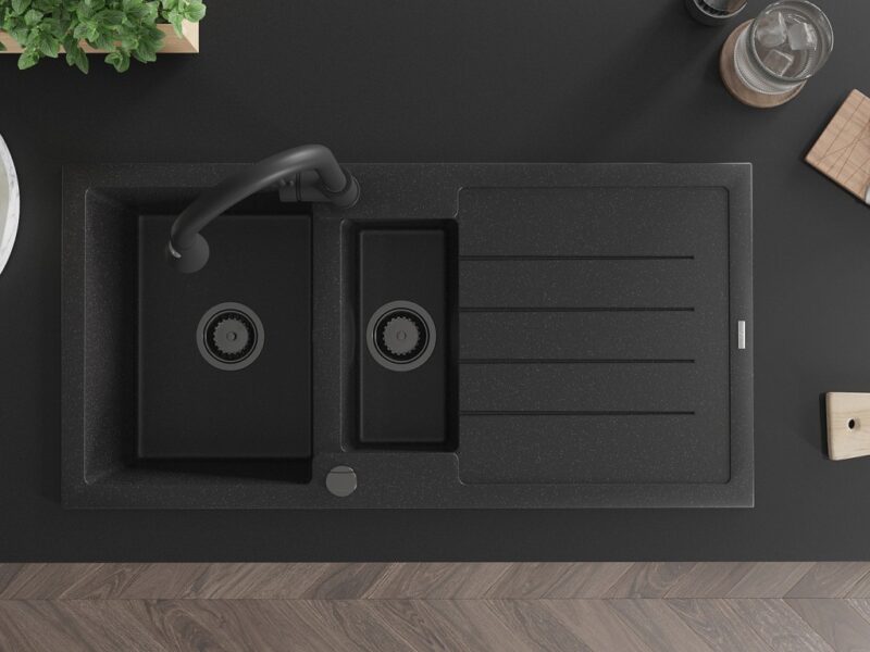 Technické dáta: Drez: Rozmer: 1000x500x200 mm Hĺbka komory: 190 mm (väčšia), 115 mm (menšia) Rozmery komory: 430×330 mm (väčšie), 340×170 mm (menšie) Priemer odtoku: ø90 mm Typ: 1,5-miska s odkvapkávačom Typ: Zapustené do pracovnej dosky Farba: čierna/strieborná metalíza Povrchová úprava sifónu: čierna Materiál: žula (80% žulové kamenivo 20% živice) Prepadový otvor: Áno Otvory: (batérie, automat) 2 Inštalácia: Univerzálna, je možné inštalovať s odkvapkávačom na ľavú alebo pravú stranu Vysoká odolnosť proti poškriabaniu a zmene farby Odolnosť proti tepelným šokom Povrch pre ľahké čistenie Dva dodatočné vyfrézované otvory na samodierovanie ø35 Kuchynská batéria: Materiál: mosadz Čierna farba Hlava: Keramická Perlátor: Áno Typ: Jednopákové Výška batérie: 380 mm Rozsah výtoku: 252 mm Typ výtoku: Výsuvný(GT) Ean: 5905315031136