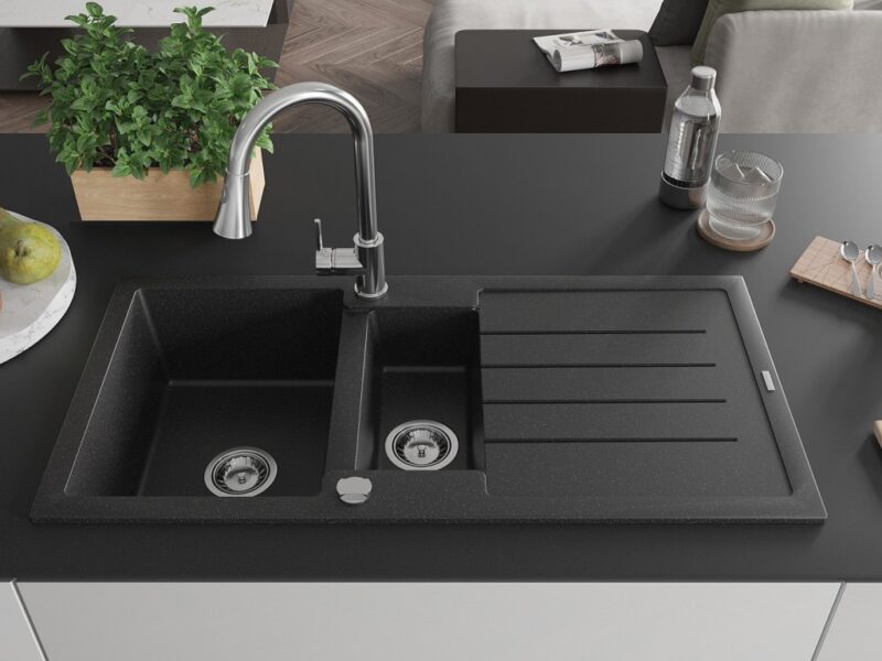 MEXEN/S MEXEN/S – Andres granitový drez s odkvapkávačom vrátane batérie Elia, čierna/strieborná metalík 6515-73-670101-00