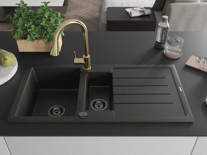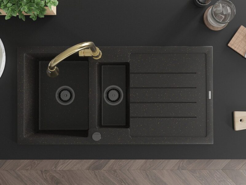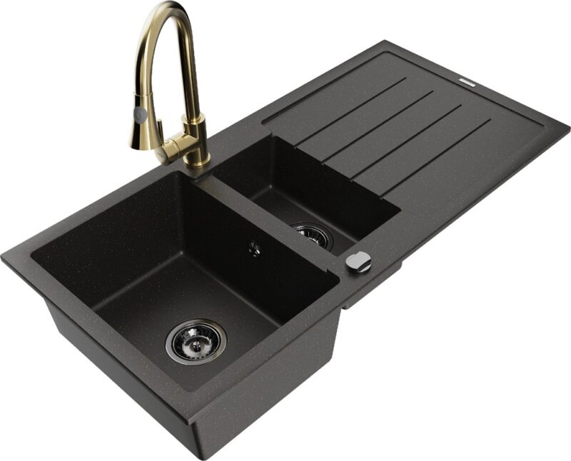 Technické dáta: Drez: Rozmer: 1000x500x200 mm Hĺbka komory: 190 mm (väčšia), 115 mm (menšia) Rozmery komory: 430×330 mm (väčšie), 340×170 mm (menšie) Priemer odtoku: ø90 mm Typ: 1,5-miska s odkvapkávačom Typ: Zapustené do pracovnej dosky Farba: čierna / zlatá metalíza Povrchová úprava sifónu: čierna Materiál: žula (80% žulové kamenivo 20% živice) Prepadový otvor: Áno Otvory: (batérie, automat) 2 Inštalácia: Univerzálna, je možné inštalovať s odkvapkávačom na ľavú alebo pravú stranu Vysoká odolnosť proti poškriabaniu a zmene farby Odolnosť proti tepelným šokom Povrch pre ľahké čistenie Dva dodatočné vyfrézované otvory na samodierovanie ø35 Kuchynská batéria: Materiál: mosadz Farba: Zlatá Hlava: Keramická Perlátor: Áno Typ: Jednopákové Výška batérie: 380 mm Rozsah výtoku: 252 mm Typ výtoku: Výsuvný(GT) Ean: 5905315031167