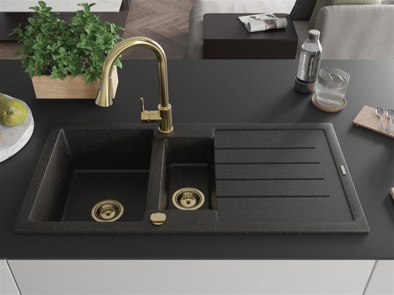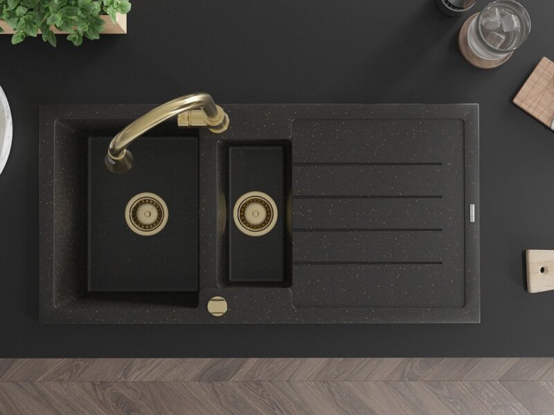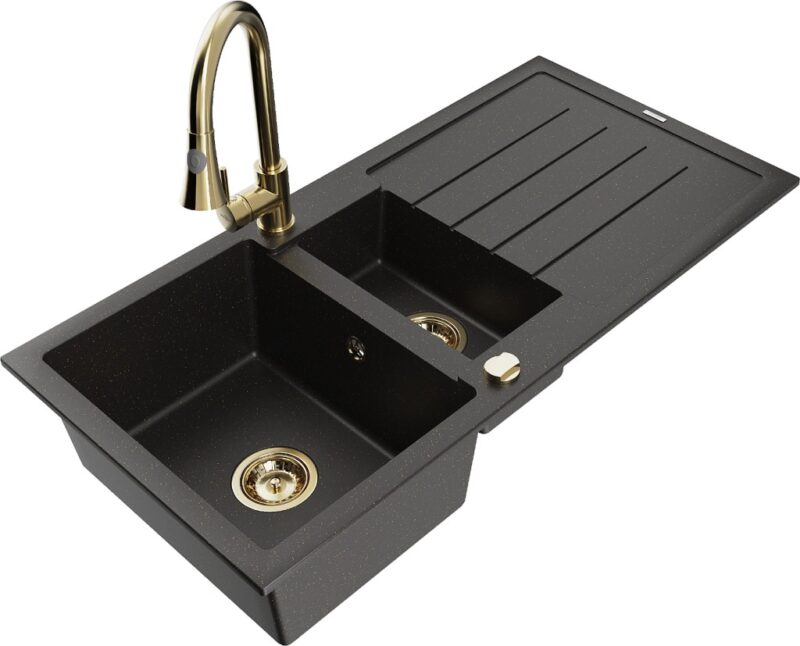 Technické dáta: Drez: Rozmer: 1000x500x200 mm Hĺbka komory: 190 mm (väčšia), 115 mm (menšia) Rozmery komory: 430×330 mm (väčšie), 340×170 mm (menšie) Priemer odtoku: ø90 mm Typ: 1,5-miska s odkvapkávačom Typ: Zapustené do pracovnej dosky Farba: čierna / zlatá metalíza Povrchová úprava sifónu: zlatá Materiál: žula (80% žulové kamenivo 20% živice) Prepadový otvor: Áno Otvory: (batérie, automat) 2 Inštalácia: Univerzálna, je možné inštalovať s odkvapkávačom na ľavú alebo pravú stranu Vysoká odolnosť proti poškriabaniu a zmene farby Odolnosť proti tepelným šokom Povrch pre ľahké čistenie Dva dodatočné vyfrézované otvory na samodierovanie ø35 Kuchynská batéria: Materiál: mosadz Farba: Zlatá Hlava: Keramická Perlátor: Áno Typ: Jednopáková Výška batérie: 380 mm Rozsah výtoku: 252 mm Typ výtoku: Výsuvný(GT) Ean: 5905315031150