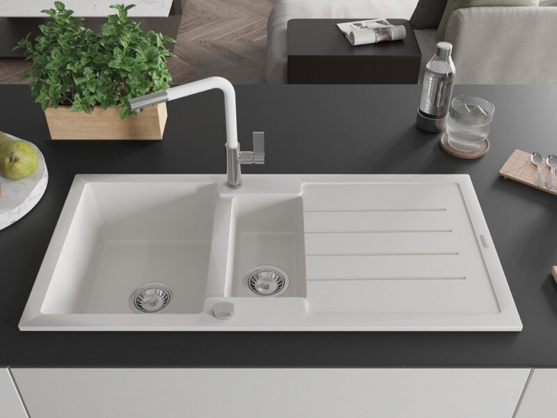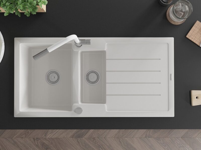Technické údaje: Kuchynský drez: Rozmer: 1000x500x200 mm Hĺbka komory: 190 mm (väčšia), 115 mm (menšia) Rozmery komory: 430×330 mm (väčšie), 340×170 mm (menšie) Priemer odtoku: ø90 mm Typ: 1,5-miska s odkvapkávačom Typ: Zapustené do pracovnej dosky Farba: Biela Povrchová úprava sifónu: Chrome Materiál: žula (80% žulové kamenivo 20% živice) Prepadový otvor: Áno Otvory: (batérie, automat) 2 Inštalácia: Univerzálna, je možné inštalovať s odkvapkávačom na ľavú alebo pravú stranu Vysoká odolnosť proti poškriabaniu a zmene farby Odolnosť proti tepelným šokom Povrch pre ľahké čistenie Dva dodatočné vyfrézované otvory na samodierovanie ø35 Kuchynská batéria: Materiál: mosadz Farba: chróm/biela Hlava: Keramická Perlátor: Áno Typ: Jednopákové Rozsah výtoku: 245 mm Výška batérie: 307 mm(GT) Ean: 5905315061966