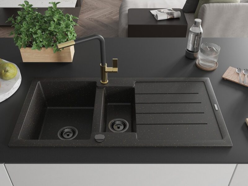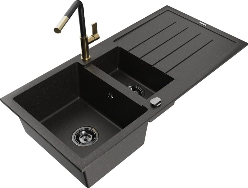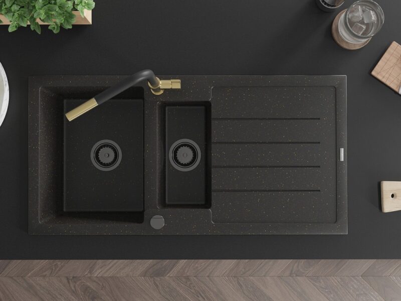 Technické dáta: Drez: Rozmer: 1000x500x200 mm Hĺbka komory: 190 mm (väčšia), 115 mm (menšia) Rozmery komory: 430×330 mm (väčšie), 340×170 mm (menšie) Priemer odtoku: ø90 mm Typ: 1,5-miska s odkvapkávačom Typ: Zapustené do pracovnej dosky Farba: čierna / zlatá metalíza Povrchová úprava sifónu: čierna Materiál: žula (80% žulové kamenivo 20% živice) Prepadový otvor: Áno Otvory: (batérie, automat) 2 Inštalácia: Univerzálna, je možné inštalovať s odkvapkávačom na ľavú alebo pravú stranu Vysoká odolnosť proti poškriabaniu a zmene farby Odolnosť proti tepelným šokom Povrch pre ľahké čistenie Dva dodatočné vyfrézované otvory na samodierovanie ø35 Kuchynská batéria: Materiál: mosadz Farba: Zlatá/Čierna Hlava: Keramická Perlátor: Áno Typ: Jednopákové Rozsah výtoku: 245 mm Výška batérie: 307 mm(GT) Ean: 5905315062277
