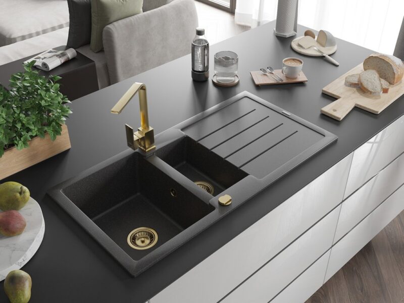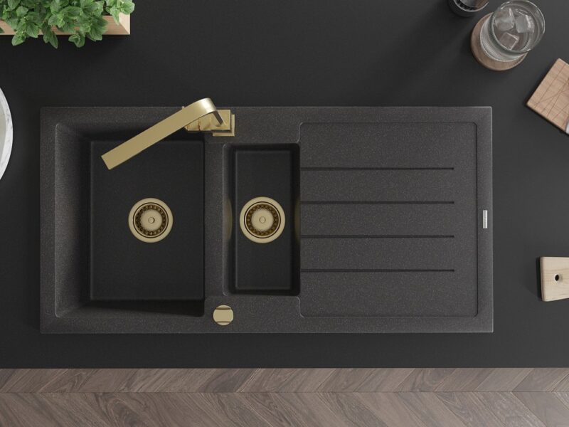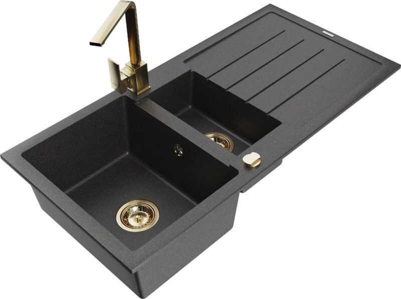 Technické dáta: Drez: Rozmer: 1000x500x200 mm Hĺbka komory: 190 mm (väčšia), 115 mm (menšia) Rozmery komory: 430×330 mm (väčšie), 340×170 mm (menšie) Priemer odtoku: ø90 mm Typ: 1,5-miska s odkvapkávačom Typ: Zapustené do pracovnej dosky Farba: Škvrnitá čierna Povrchová úprava sifónu: zlatá Materiál: žula (80% žulové kamenivo 20% živice) Prepadový otvor: Áno Otvory: (batérie, automat) 2 Inštalácia: Univerzálna, je možné inštalovať s odkvapkávačom na ľavú alebo pravú stranu Vysoká odolnosť proti poškriabaniu a zmene farby Odolnosť proti tepelným šokom Povrch pre ľahké čistenie Dva dodatočné vyfrézované otvory na samodierovanie ø35 Kuchynská batéria: Materiál: mosadz Farba: Zlatá Hlava: Keramická Perlátor: Áno Typ: Jednopákové Výška batérie: 290 mm Rozsah výtoku: 220 mm(GT) Ean: 5905315020963