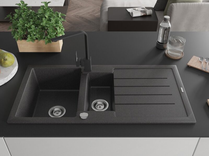 Technické dáta: Drez: Rozmer: 1000x500x200 mm Hĺbka komory: 190 mm (väčšia), 115 mm (menšia) Rozmery komory: 430×330 mm (väčšie), 340×170 mm (menšie) Priemer odtoku: ø90 mm Typ: 1,5-miska s odkvapkávačom Typ: Zapustené do pracovnej dosky Farba: Škvrnitá čierna Povrchová úprava sifónu: Chrome Materiál: žula (80% žulové kamenivo 20% živice) Prepadový otvor: Áno Otvory: (batérie, automat) 2 Inštalácia: Univerzálna, je možné inštalovať s odkvapkávačom na ľavú alebo pravú stranu Vysoká odolnosť proti poškriabaniu a zmene farby Odolnosť proti tepelným šokom Povrch pre ľahké čistenie Dva dodatočné vyfrézované otvory na samodierovanie ø35 Kuchynská batéria: Materiál: mosadz Čierna farba Hlava: Keramická Perlátor: Áno Typ: Jednopákové Výška batérie: 290 mm Rozsah výtoku: 220 mm(GT) Ean: 5905315020970