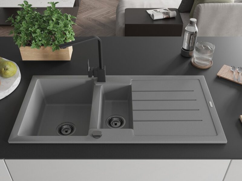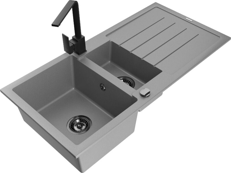 Technické dáta: Drez: Rozmer: 1000x500x200 mm Hĺbka komory: 190 mm (väčšia), 115 mm (menšia) Rozmery komory: 430×330 mm (väčšie), 340×170 mm (menšie) Priemer odtoku: ø90 mm Typ: 1,5-miska s odkvapkávačom Typ: Zapustené do pracovnej dosky Šedá farba Povrchová úprava sifónu: čierna Materiál: žula (80% žulové kamenivo 20% živice) Prepadový otvor: Áno Otvory: (batérie, automat) 2 Inštalácia: Univerzálna, je možné inštalovať s odkvapkávačom na ľavú alebo pravú stranu Vysoká odolnosť proti poškriabaniu a zmene farby Odolnosť proti tepelným šokom Povrch pre ľahké čistenie Dva dodatočné vyfrézované otvory na samodierovanie ø35 Kuchynská batéria: Materiál: mosadz Čierna farba Hlava: Keramická Perlátor: Áno Typ: Jednopákové Výška batérie: 290 mm Rozsah výtoku: 220 mm(GT) Ean: 5905315020840