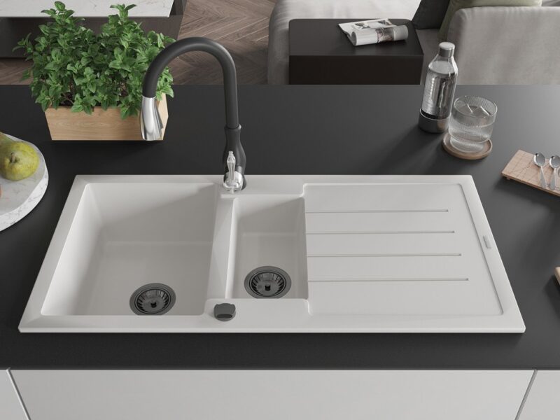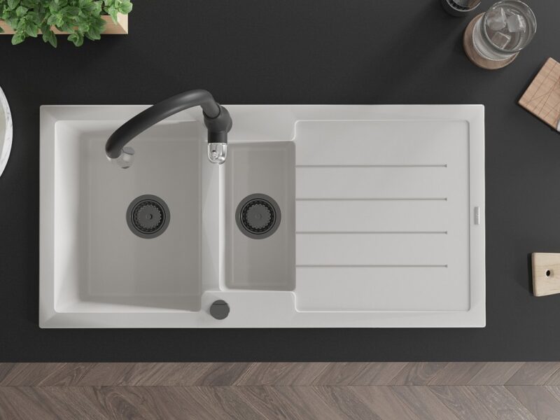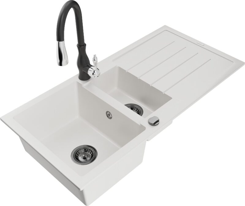 Technické údaje: Kuchynský drez: Rozmer: 1000x500x200 mm Hĺbka komory: 190 mm (väčšia), 115 mm (menšia) Rozmery komory: 430×330 mm (väčšie), 340×170 mm (menšie) Priemer odtoku: ø90 mm Typ: 1,5-miska s odkvapkávačom Typ: Zapustené do pracovnej dosky Farba: Biela Povrchová úprava sifónu: čierna Materiál: žula (80% žulové kamenivo 20% živice) Prepadový otvor: Áno Otvory: (batérie, automat) 2 Inštalácia: Univerzálna, je možné inštalovať s odkvapkávačom na ľavú alebo pravú stranu Vysoká odolnosť proti poškriabaniu a zmene farby Odolnosť proti tepelným šokom Povrch pre ľahké čistenie Dva dodatočné vyfrézované otvory na samodierovanie ø35 Kuchynská batéria: Materiál: mosadz Farba: Čierna Hlava: Keramická Perlátor: Áno Typ: Jednopáková Výška batérie: 410 mm Rozsah výtoku: 231 mm(GT) Ean: 5905315036117