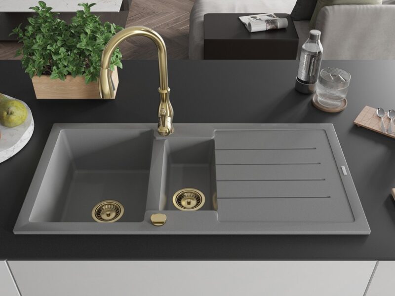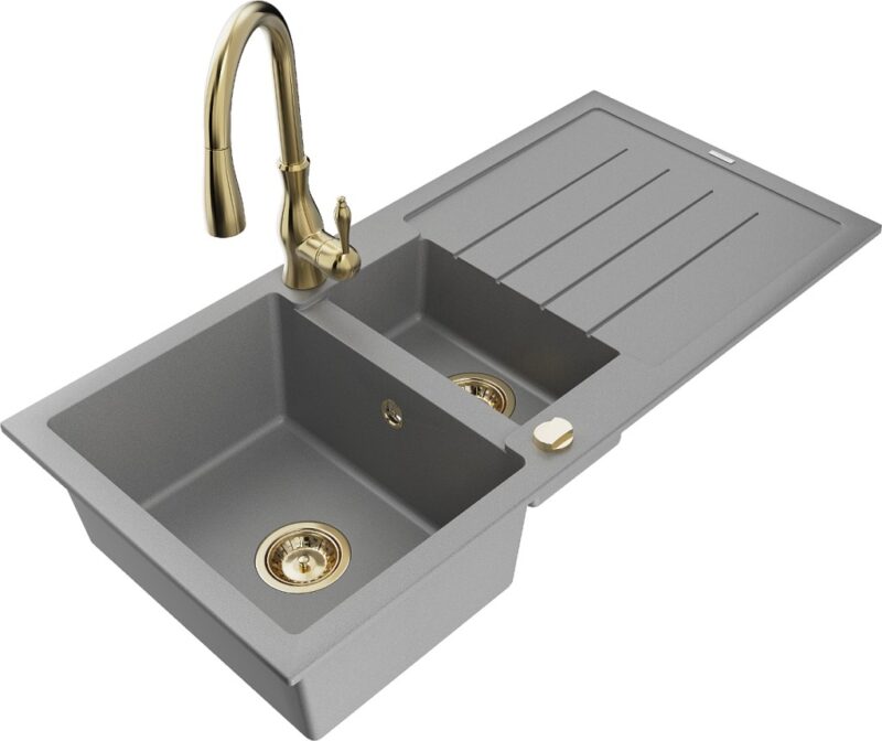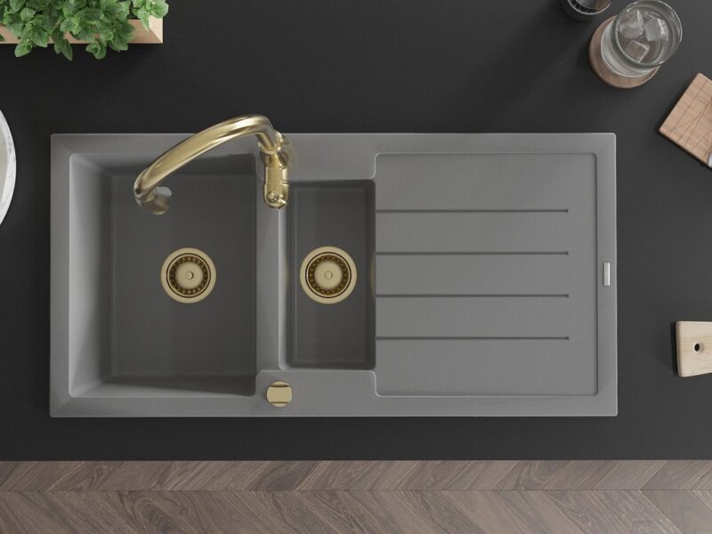 Technické dáta: Drez: Rozmer: 1000x500x200 mm Hĺbka komory: 190 mm (väčšia), 115 mm (menšia) Rozmery komory: 430×330 mm (väčšie), 340×170 mm (menšie) Priemer odtoku: ø90 mm Typ: 1,5-miska s odkvapkávačom Typ: Zapustené do pracovnej dosky Šedá farba Povrchová úprava sifónu: zlatá Materiál: žula (80% žulové kamenivo 20% živice) Prepadový otvor: Áno Otvory: (batérie, automat) 2 Inštalácia: Univerzálna, je možné inštalovať s odkvapkávačom na ľavú alebo pravú stranu Vysoká odolnosť proti poškriabaniu a zmene farby Odolnosť proti tepelným šokom Povrch pre ľahké čistenie Dva dodatočné vyfrézované otvory na samodierovanie ø35 Kuchynská batéria: Materiál: mosadz Farba: Zlatá Hlava: Keramická Perlátor: Áno Typ: Jednopákové Výška batérie: 410 mm Rozsah výtoku: 231 mm(GT) Ean: 5905315036179