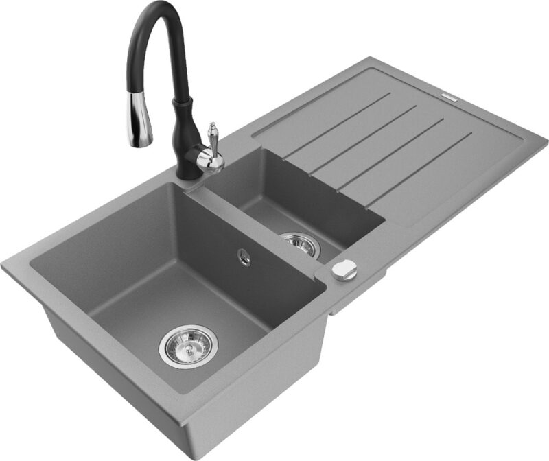 Technické dáta: Drez: Rozmer: 1000x500x200 mm Hĺbka komory: 190 mm (väčšia), 115 mm (menšia) Rozmery komory: 430×330 mm (väčšie), 340×170 mm (menšie) Priemer odtoku: ø90 mm Typ: 1,5-miska s odkvapkávačom Typ: Zapustené do pracovnej dosky Šedá farba Povrchová úprava sifónu: Chrome Materiál: žula (80% žulové kamenivo 20% živice) Prepadový otvor: Áno Otvory: (batérie, automat) 2 Inštalácia: Univerzálna, je možné inštalovať s odkvapkávačom na ľavú alebo pravú stranu Vysoká odolnosť proti poškriabaniu a zmene farby Odolnosť proti tepelným šokom Povrch pre ľahké čistenie Dva dodatočné vyfrézované otvory na samodierovanie ø35 Kuchynská batéria: Materiál: mosadz Čierna farba Hlava: Keramická Perlátor: Áno Typ: Jednopákové Výška batérie: 410 mm Rozsah výtoku: 231 mm(GT) Ean: 5905315036186