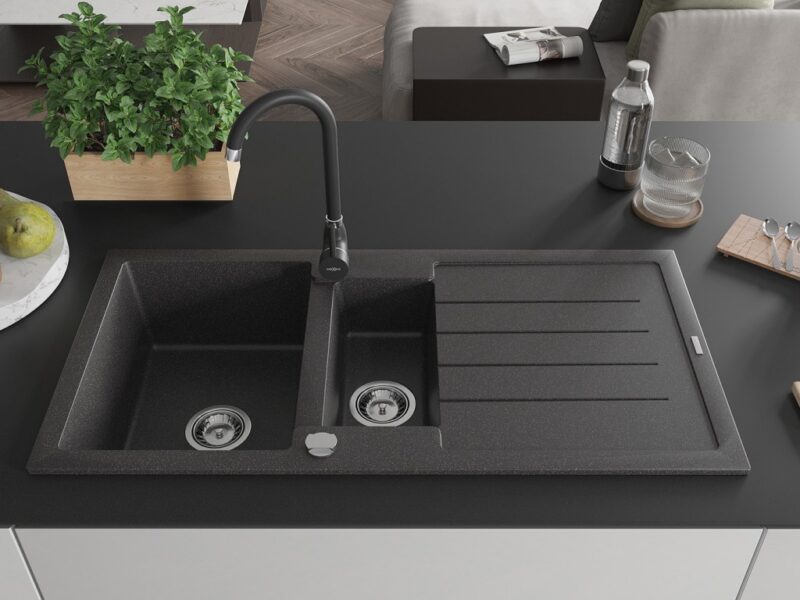 Technické dáta: Drez: Rozmer: 1000x500x200 mm Hĺbka komory: 190 mm (väčšia), 115 mm (menšia) Rozmery komory: 430×330 mm (väčšie), 340×170 mm (menšie) Priemer odtoku: ø90 mm Typ: 1,5-miska s odkvapkávačom Typ: Zapustené do pracovnej dosky Farba: Škvrnitá čierna Povrchová úprava sifónu: Chrome Materiál: žula (80% žulové kamenivo 20% živice) Prepadový otvor: Áno Otvory: (batérie, automat) 2 Inštalácia: Univerzálna, je možné inštalovať s odkvapkávačom na ľavú alebo pravú stranu Vysoká odolnosť proti poškriabaniu a zmene farby Odolnosť proti tepelným šokom Povrch pre ľahké čistenie Dva dodatočné vyfrézované otvory na samodierovanie ø35 Kuchynská batéria: Materiál: mosadz Čierna farba Hlava: Keramická Perlátor: Áno Typ: Jednopákové Výška batérie: 335 mm Rozsah výtoku: 180 mm(GT) Ean: 5905315015891
