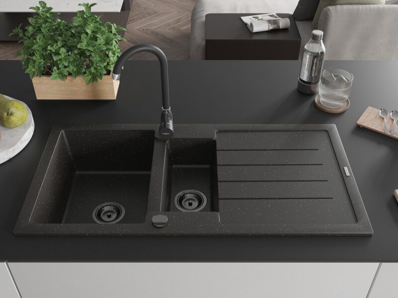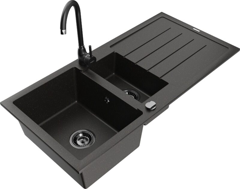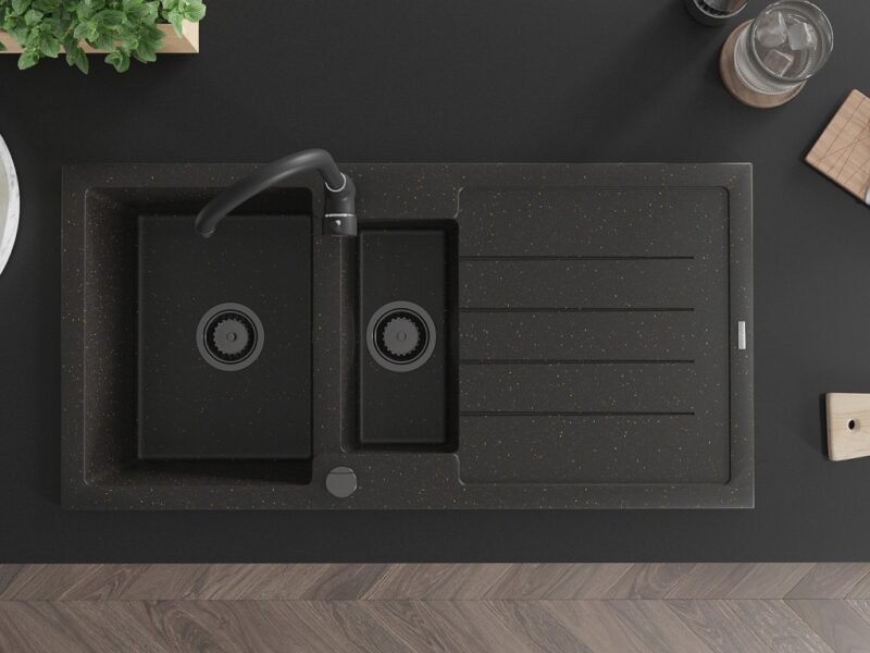 Technické dáta: Drez: Rozmer: 1000x500x200 mm Hĺbka komory: 190 mm (väčšia), 115 mm (menšia) Rozmery komory: 430×330 mm (väčšie), 340×170 mm (menšie) Priemer odtoku: ø90 mm Typ: 1,5-miska s odkvapkávačom Typ: Zapustené do pracovnej dosky Farba: čierna / zlatá metalíza Povrchová úprava sifónu: čierna Materiál: žula (80% žulové kamenivo 20% živice) Prepadový otvor: Áno Otvory: (batérie, automat) 2 Inštalácia: Univerzálna, je možné inštalovať s odkvapkávačom na ľavú alebo pravú stranu Vysoká odolnosť proti poškriabaniu a zmene farby Odolnosť proti tepelným šokom Povrch pre ľahké čistenie Dva dodatočné vyfrézované otvory na samodierovanie ø35 Kuchynská batéria: Materiál: mosadz Čierna farba Hlava: Keramická Perlátor: Áno Typ: Jednopáková Výška batérie: 335 mm Rozsah výtoku: 180 mm(GT) Ean: 5905315015877