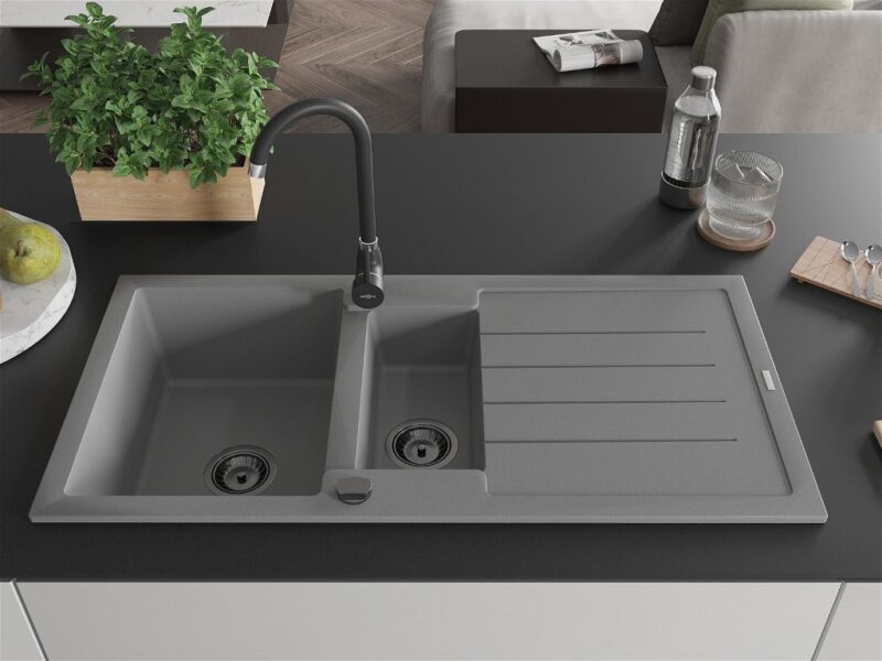 Technické dáta: Drez: Rozmer: 1000x500x200 mm Hĺbka komory: 190 mm (väčšia), 115 mm (menšia) Rozmery komory: 430×330 mm (väčšie), 340×170 mm (menšie) Priemer odtoku: ø90 mm Typ: 1,5-miska s odkvapkávačom Typ: Zapustené do pracovnej dosky Šedá farba Povrchová úprava sifónu: čierna Materiál: žula (80% žulové kamenivo 20% živice) Prepadový otvor: Áno Otvory: (batérie, automat) 2 Inštalácia: Univerzálna, je možné inštalovať s odkvapkávačom na ľavú alebo pravú stranu Vysoká odolnosť proti poškriabaniu a zmene farby Odolnosť proti tepelným šokom Povrch pre ľahké čistenie Dva dodatočné vyfrézované otvory na samodierovanie ø35 Kuchynská batéria: Materiál: mosadz Čierna farba Hlava: Keramická Perlátor: Áno Typ: Jednopáková Výška batérie: 335 mm Rozsah výtoku: 180 mm(GT) Ean: 5905315015822