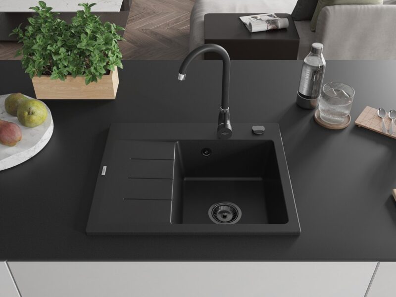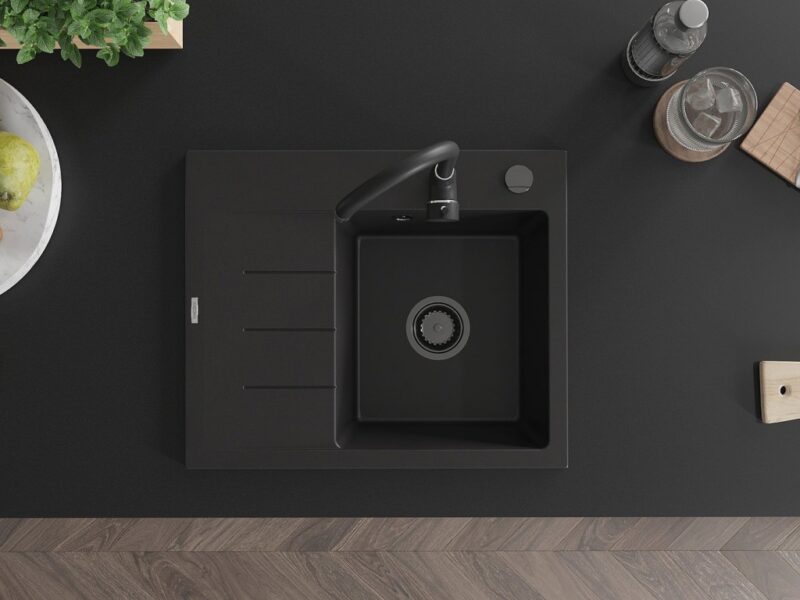 MEXEN/S MEXEN/S – Ben granitový drez 1 s odkvapkávačom pravý 600 x 500 mm, čierna, sifón čierna 6523605000-77-B