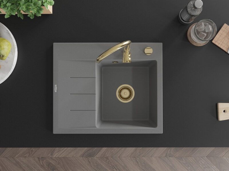 MEXEN/S MEXEN/S – Ben granitový drez 1 s odkvapkávačom pravý 600 x 500 mm, sivý, sifón zlatá 6523605000-71-G
