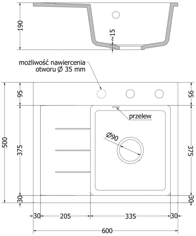 Špecifikácia produktu: Rozmer: 600x500x190 mm Hĺbka komory: 190 mm Rozmery komory: 375×335 mm Priemer odtoku: ø90 mm Typ: 1-miska s krátkym odkvapkávačom Typ: Zapustený do pracovnej dosky, pravý Materiál: žula Farba: Sivá Povrchová úprava sifónu: zlatá Prepadový otvor: Áno Otvor pre batériu: Áno Vrátane automatického sifónu Vysoká odolnosť proti poškriabaniu a zmene farby Odolnosť proti tepelným šokom Povrch pre ľahké čistenie Jeden dodatočný vyfrézovaný otvor na samodierovanie ø35(GT) Ean: 5905315462169