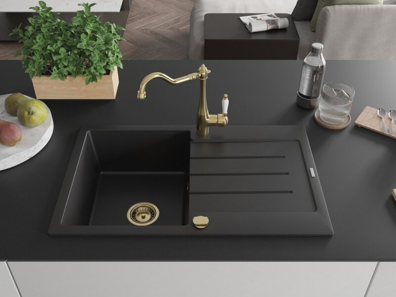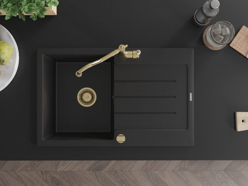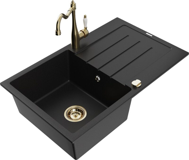Technické dáta: drez: Rozmer: 795 x 495 x 200 mm Hĺbka komory: 200 mm Rozmery komory: 440×360 mm Priemer odtoku: ø90 mm Typ: 1-miska s odkvapkávačom Typ: Zapustené do pracovnej dosky Čierna farba Povrchová úprava sifónu: zlatá Materiál: žula (80% žulové kamenivo, 20% živice) Prepadový otvor: Áno Otvory: (batérie, automatické) 2 Inštalácia: Univerzálna, je možné inštalovať s odkvapkávačom na ľavú alebo pravú stranu Vysoká odolnosť proti poškriabaniu a zmene farby Odolnosť proti tepelným šokom Ľahko čistiteľný povrch Dva dodatočné vyfrézované otvory na samodierovanie ø35 kuchynská batéria: Materiál: mosadz Farba: Zlatá Hlava: Keramická Prevzdušňovač: Áno Typ: Jedna páka Výška batérie: 290 mm Rozsah výtoku: 260 mm(GT) Ean: 5905315040862