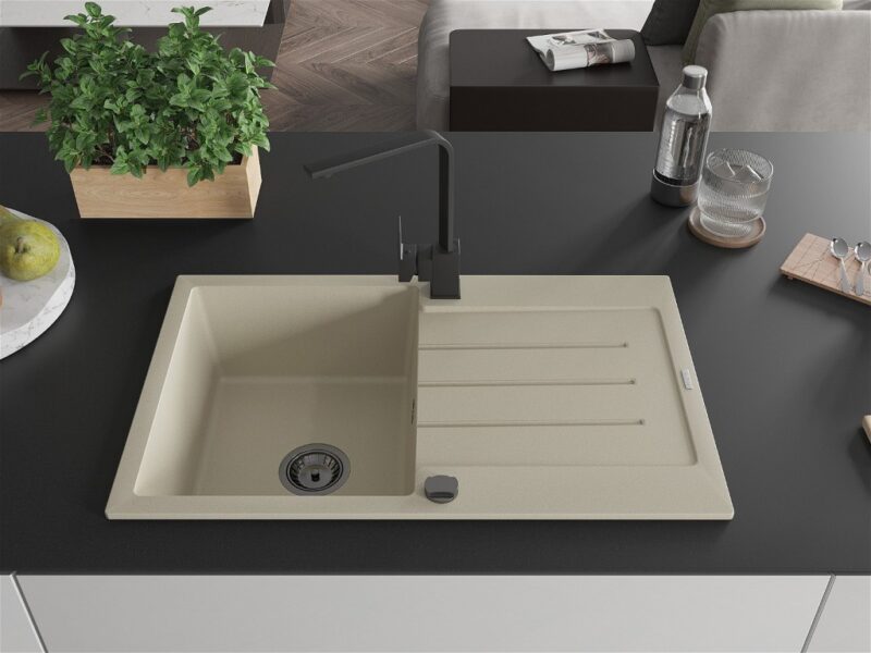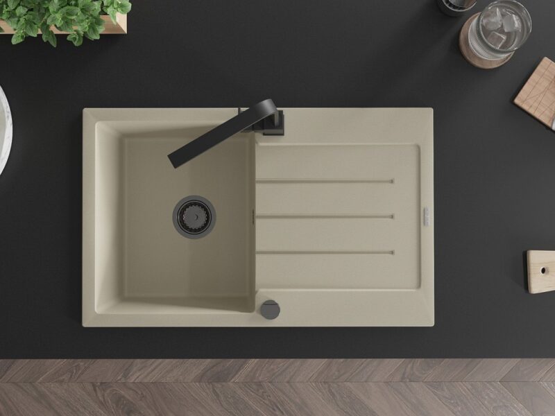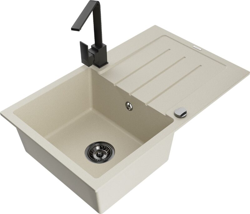Technické dáta: drez: Rozmer: 795 x 495 x 200 mm Hĺbka komory: 200 mm Rozmery komory: 440×360 mm Priemer odtoku: ø90 mm Typ: 1-miska s odkvapkávačom Typ: Zapustené do pracovnej dosky Farba béžová Povrchová úprava sifónu: čierna Materiál: žula (80% žulové kamenivo, 20% živice) Prepadový otvor: Áno Otvory: (batérie, automatické) 2 Inštalácia: Univerzálna, je možné inštalovať s odkvapkávačom na ľavú alebo pravú stranu Vysoká odolnosť proti poškriabaniu a zmene farby Odolnosť proti tepelným šokom Ľahko čistiteľný povrch Dva dodatočné vyfrézované otvory na samodierovanie ø35 kuchynská batéria: Materiál: mosadz Čierna farba Hlava: Keramická Prevzdušňovač: Áno Typ: Jedna páka Výška batérie: 290 mm Rozsah výtoku: 220 mm(GT) Ean: 5905315020161