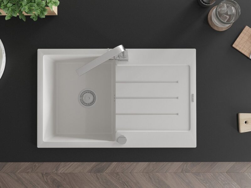 Technické dáta: drez: Rozmer: 795 x 495 x 200 mm Hĺbka komory: 200 mm Rozmery komory: 440×360 mm Priemer odtoku: ø90 mm Typ: 1-miska s odkvapkávačom Typ: Zapustené do pracovnej dosky biela farba Povrchová úprava sifónu: Chrome Materiál: žula (80% žulové kamenivo, 20% živice) Prepadový otvor: Áno Otvory: (batérie, automatické) 2 Inštalácia: Univerzálna, je možné inštalovať s odkvapkávačom na ľavú alebo pravú stranu Vysoká odolnosť proti poškriabaniu a zmene farby Odolnosť proti tepelným šokom Ľahko čistiteľný povrch Dva dodatočné vyfrézované otvory na samodierovanie ø35 kuchynská batéria: Materiál: mosadz Farba: Chrome Hlava: Keramická Prevzdušňovač: Áno Typ: Jedna páka Výška batérie: 290 mm Rozsah výtoku: 220 mm(GT) Ean: 5905315020093