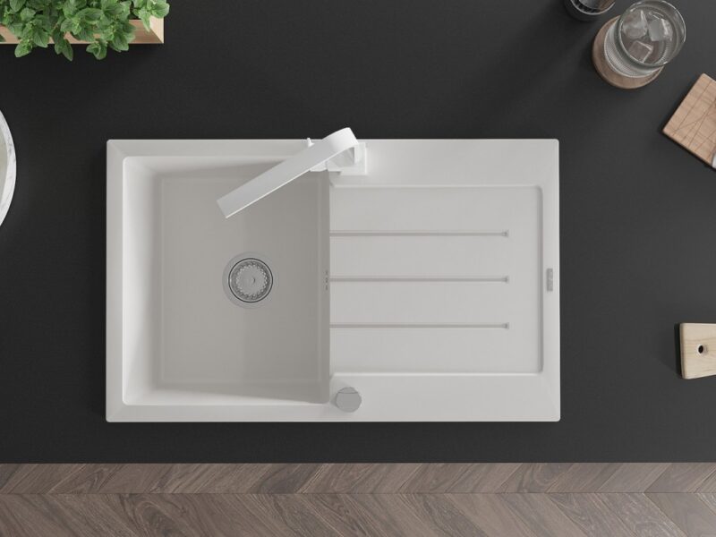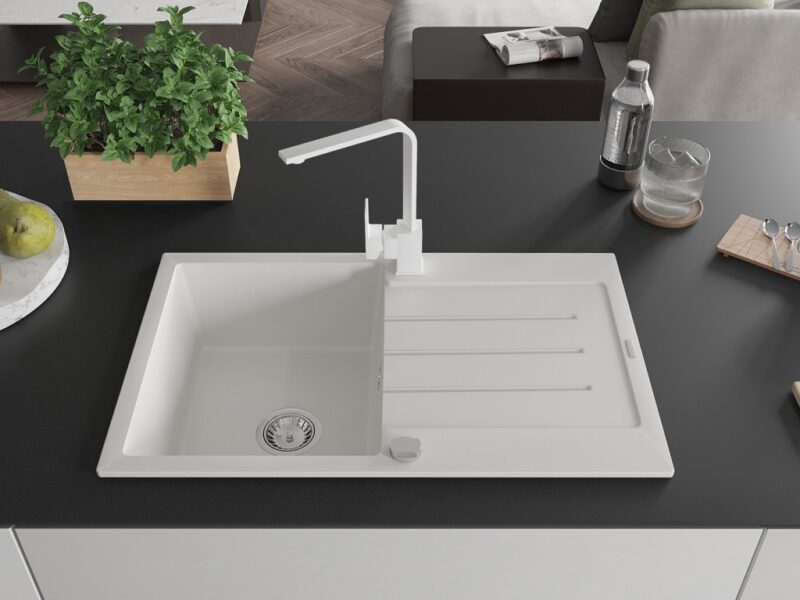 Technické dáta: drez: Rozmer: 795 x 495 x 200 mm Hĺbka komory: 200 mm Rozmery komory: 440×360 mm Priemer odtoku: ø90 mm Typ: 1-miska s odkvapkávačom Typ: Zapustené do pracovnej dosky biela farba Povrchová úprava sifónu: Chrome Materiál: žula (80% žulové kamenivo, 20% živice) Prepadový otvor: Áno Otvory: (batérie, automatické) 2 Inštalácia: Univerzálna, je možné inštalovať s odkvapkávačom na ľavú alebo pravú stranu Vysoká odolnosť proti poškriabaniu a zmene farby Odolnosť proti tepelným šokom Ľahko čistiteľný povrch Dva dodatočné vyfrézované otvory na samodierovanie ø35 kuchynská batéria: Materiál: mosadz biela farba Hlava: Keramická Prevzdušňovač: Áno Typ: Jedna páka Výška batérie: 290 mm Rozsah výtoku: 220 mm(GT) Ean: 5905315020109