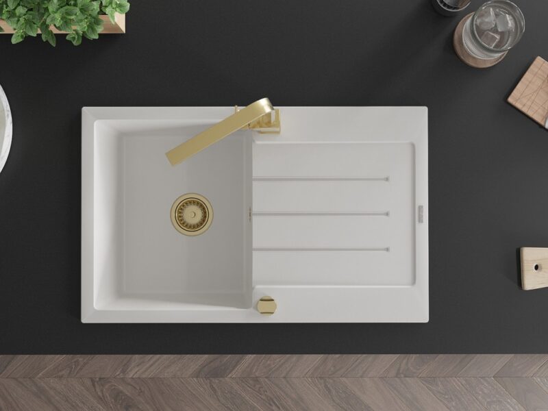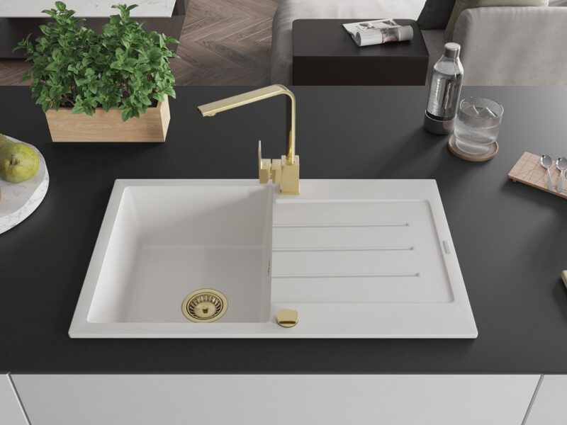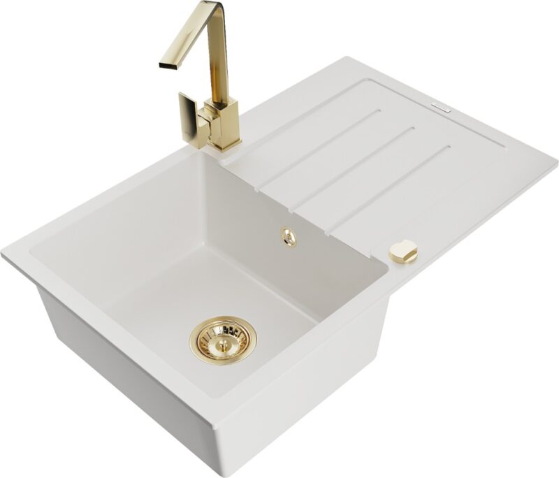 Technické dáta: drez: Rozmer: 795 x 495 x 200 mm Hĺbka komory: 200 mm Rozmery komory: 440×360 mm Priemer odtoku: ø90 mm Typ: 1-miska s odkvapkávačom Typ: Zapustené do pracovnej dosky biela farba Povrchová úprava sifónu: zlatá Materiál: žula (80% žulové kamenivo, 20% živice) Prepadový otvor: Áno Otvory: (batérie, automatické) 2 Inštalácia: Univerzálna, je možné inštalovať s odkvapkávačom na ľavú alebo pravú stranu Vysoká odolnosť proti poškriabaniu a zmene farby Odolnosť proti tepelným šokom Ľahko čistiteľný povrch Dva dodatočné vyfrézované otvory na samodierovanie ø35 kuchynská batéria: Materiál: mosadz Farba: Zlatá Hlava: Keramická Prevzdušňovač: Áno Typ: Jedna páka Výška batérie: 290 mm Rozsah výtoku: 220 mm(GT) Ean: 5905315020116