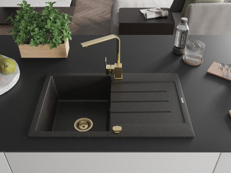 Technické dáta: drez: Rozmer: 795 x 495 x 200 mm Hĺbka komory: 200 mm Rozmery komory: 440×360 mm Priemer odtoku: ø90 mm Typ: 1-miska s odkvapkávačom Typ: Zapustené do pracovnej dosky Farba: čierna / zlatá metalíza Povrchová úprava sifónu: zlatá Materiál: žula (80% žulové kamenivo, 20% živice) Prepadový otvor: Áno Otvory: (batérie, automatické) 2 Inštalácia: Univerzálna, je možné inštalovať s odkvapkávačom na ľavú alebo pravú stranu Vysoká odolnosť proti poškriabaniu a zmene farby Odolnosť proti tepelným šokom Ľahko čistiteľný povrch Dva dodatočné vyfrézované otvory na samodierovanie ø35 kuchynská batéria: Materiál: mosadz Farba: Zlatá Hlava: Keramická Prevzdušňovač: Áno Typ: Jedna páka Výška batérie: 290 mm Rozsah výtoku: 220 mm(GT) Ean: 5905315020277