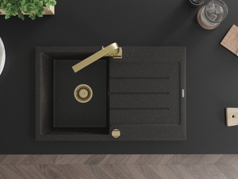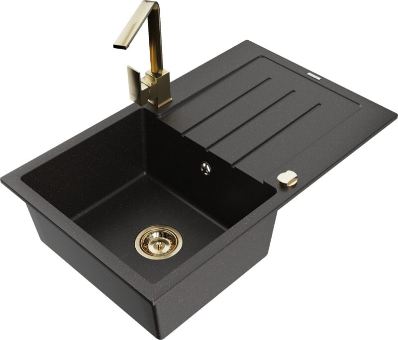 MEXEN/S MEXEN/S – Bruno granitový drez 1-miska s odkvapkávačom vrátane batérie Rita, čierny/zlatý metalik 6513-75-670300-50