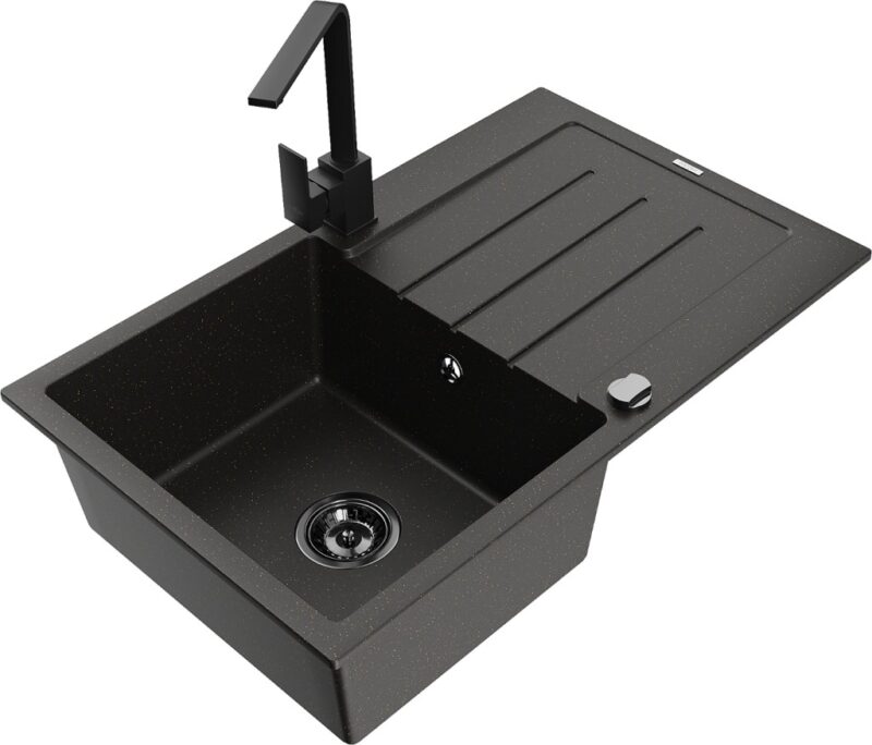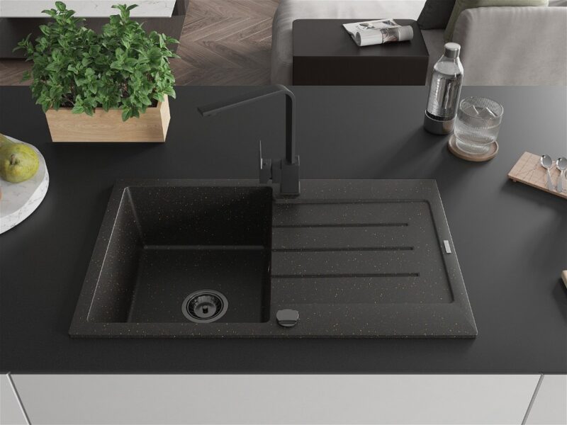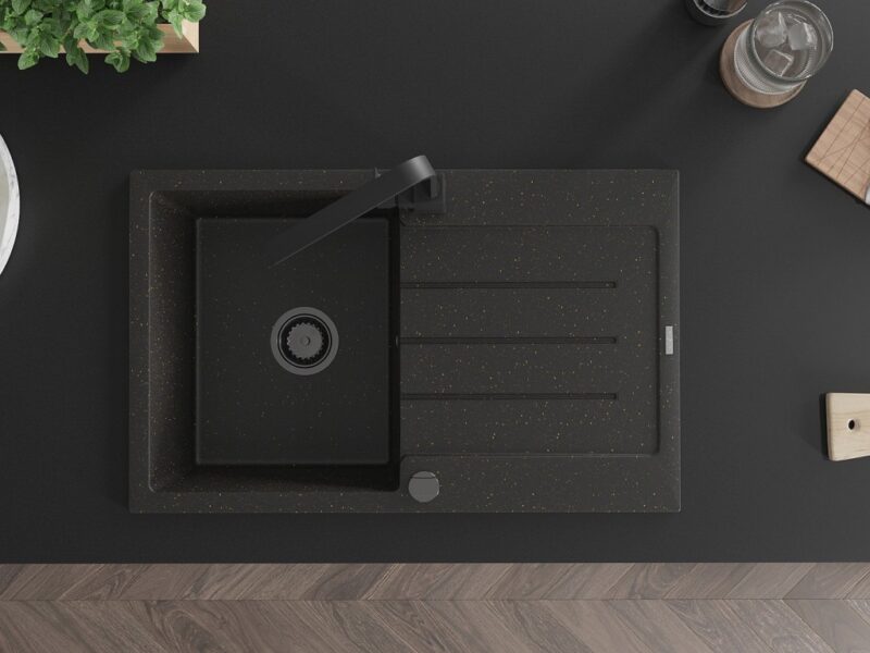 Technické dáta: drez: Rozmer: 795 x 495 x 200 mm Hĺbka komory: 200 mm Rozmery komory: 440×360 mm Priemer odtoku: ø90 mm Typ: 1-miska s odkvapkávačom Typ: Zapustené do pracovnej dosky Farba: čierna / zlatá metalíza Povrchová úprava sifónu: čierna Materiál: žula (80% žulové kamenivo, 20% živice) Prepadový otvor: Áno Otvory: (batérie, automatické) 2 Inštalácia: Univerzálna, je možné inštalovať s odkvapkávačom na ľavú alebo pravú stranu Vysoká odolnosť proti poškriabaniu a zmene farby Odolnosť proti tepelným šokom Ľahko čistiteľný povrch Dva dodatočné vyfrézované otvory na samodierovanie ø35 kuchynská batéria: Materiál: mosadz Čierna farba Hlava: Keramická Prevzdušňovač: Áno Typ: Jedna páka Výška batérie: 290 mm Rozsah výtoku: 220 mm(GT) Ean: 5905315020291