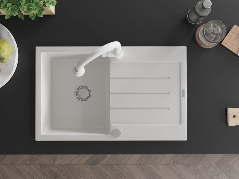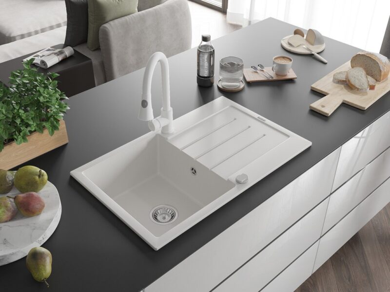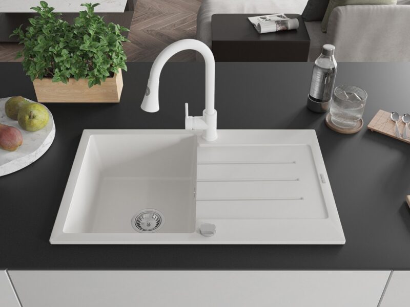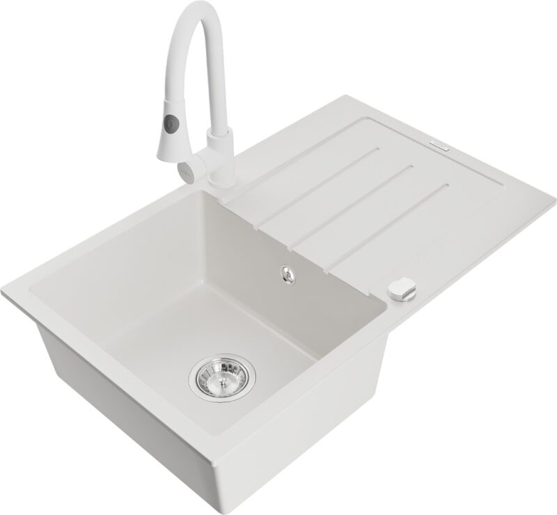 MEXEN/S MEXEN/S – Bruno granitový drez 1 s odkvapkávačom vrátane batérie Elia, biela 6513-20-670101-20