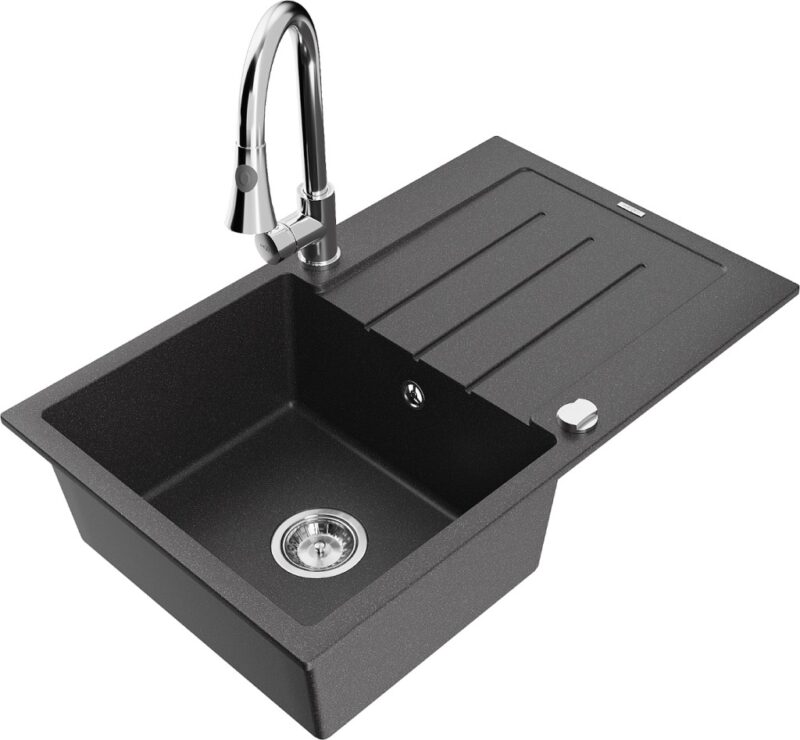 Technické dáta: drez: Rozmer: 795 x 495 x 200 mm Hĺbka komory: 200 mm Rozmery komory: 440×360 mm Priemer odtoku: ø90 mm Typ: 1-miska s odkvapkávačom Typ: Zapustené do pracovnej dosky Farba: Škvrnitá čierna Povrchová úprava sifónu: Chrome Materiál: žula (80% žulové kamenivo, 20% živice) Prepadový otvor: Áno Otvory: (batérie, automatické) 2 Inštalácia: Univerzálna, je možné inštalovať s odkvapkávačom na ľavú alebo pravú stranu Vysoká odolnosť proti poškriabaniu a zmene farby Odolnosť proti tepelným šokom Ľahko čistiteľný povrch Dva dodatočné vyfrézované otvory na samodierovanie ø35 kuchynská batéria: Materiál: mosadz Farba: Chrome Hlava: Keramická Prevzdušňovač: Áno Typ: Jedna páka Výška batérie: 380 mm Rozsah výtoku: 252 mm Typ výtoku: Výsuvný(GT) Ean: 5905315030559