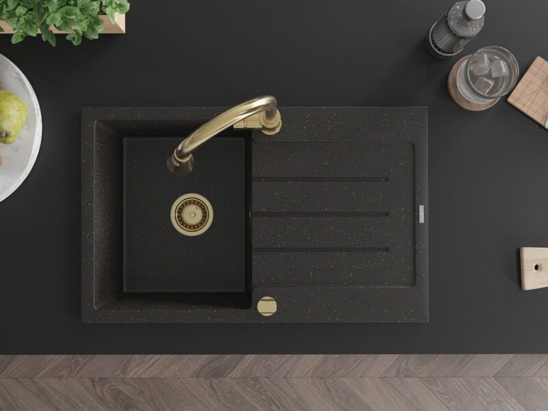 MEXEN/S MEXEN/S – Bruno granitový drez 1 s odkvapkávačom vrátane batérie Elia, čierna/zlatá metalik 6513-75-670101-50