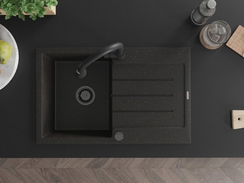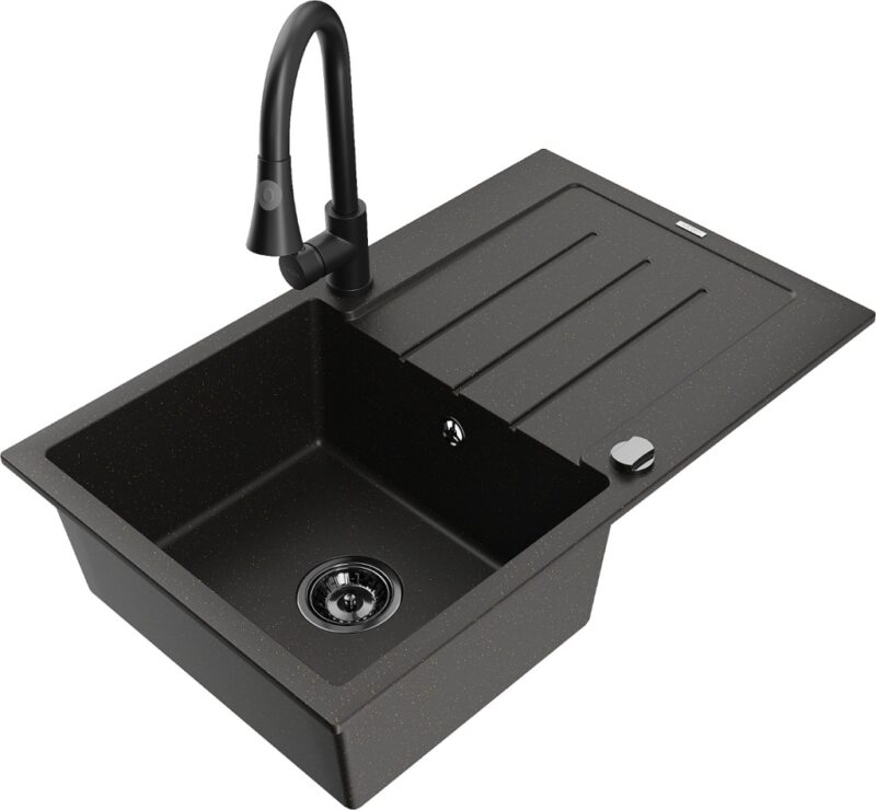 MEXEN/S MEXEN/S – Bruno granitový drez 1 s odkvapkávačom vrátane batérie Elia, čierna/zlatá metalik 6513-75-670101-70-B