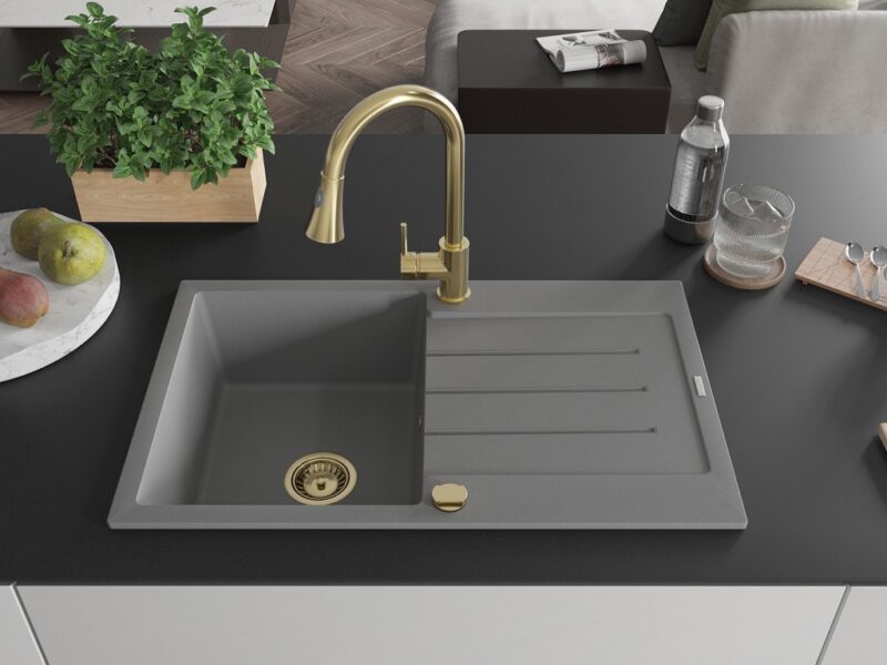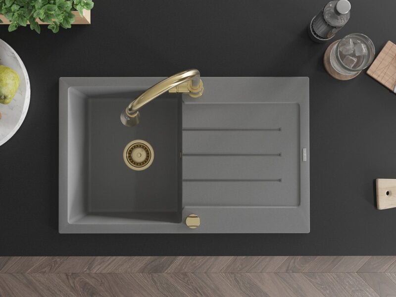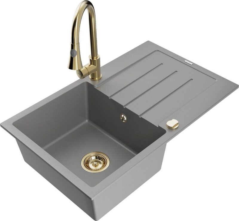 Technické dáta: drez: Rozmer: 795 x 495 x 200 mm Hĺbka komory: 200 mm Rozmery komory: 440×360 mm Priemer odtoku: ø90 mm Typ: 1-miska s odkvapkávačom Typ: Zapustené do pracovnej dosky Šedá farba Povrchová úprava sifónu: zlatá Materiál: žula (80% žulové kamenivo, 20% živice) Prepadový otvor: Áno Otvory: (batérie, automatické) 2 Inštalácia: Univerzálna, je možné inštalovať s odkvapkávačom na ľavú alebo pravú stranu Vysoká odolnosť proti poškriabaniu a zmene farby Odolnosť proti tepelným šokom Ľahko čistiteľný povrch Dva dodatočné vyfrézované otvory na samodierovanie ø35 kuchynská batéria: Materiál: mosadz Farba: Zlatá Hlava: Keramická Prevzdušňovač: Áno Typ: Jedna páka Výška batérie: 380 mm Rozsah výtoku: 252 mm Typ výtoku: Výsuvný(GT) Ean: 5905315030429